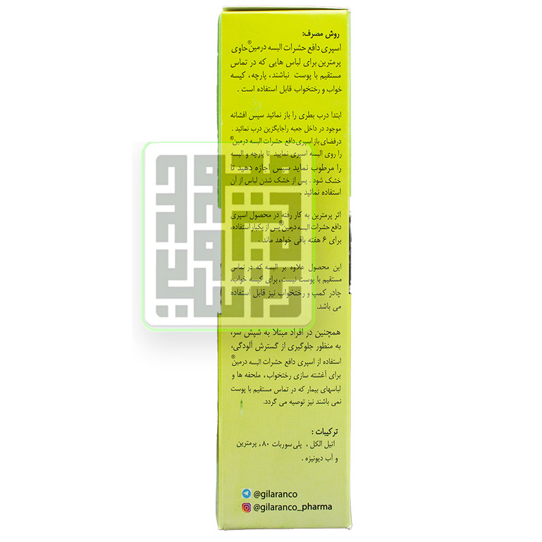 سلام خوب مگه از فرآورده هایه پرمترین نیست پس چرا نباید با پوست تماس مستقیم داشته باشه به هرحال لباس و ملحفه هم با پوست در تماس هستن واسپری شدن پس چرا باید از تماس مستقیم جلوگیری بشه اتفاقا من به پوست دستم که خیلی خارشت داشت مسقیم اسپری کردم خارشت از بین رفت
