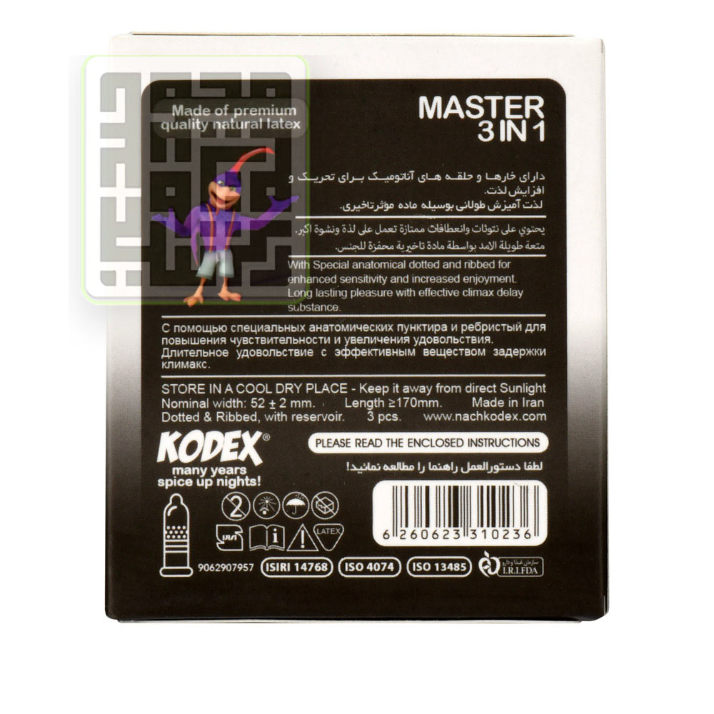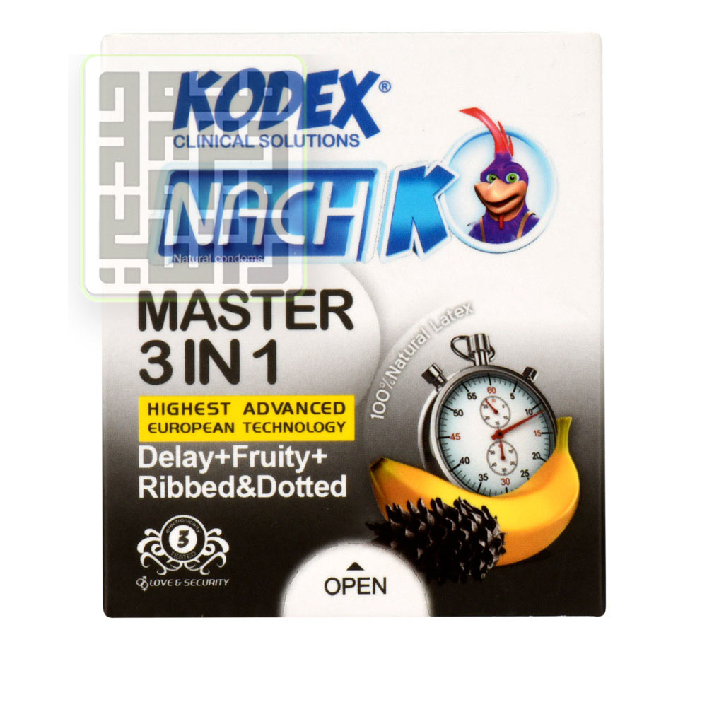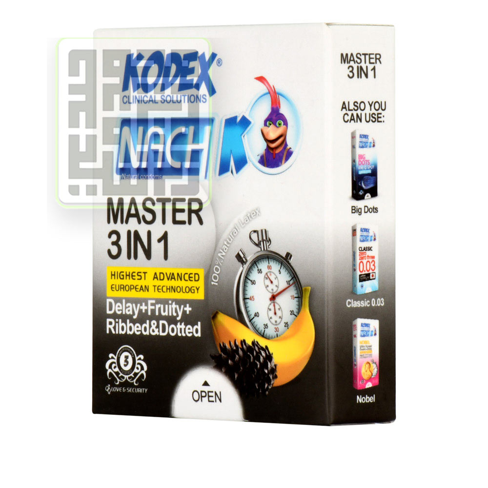 کاندوم تاخیری کدکس مدل Master 3 In 1 بسته 3 تایی یکی دیگر از محصولات برند ناچ کدکس یا کدکس است. که جزو محصولات ترکیبی با چندین خواص میشود. که لذت رابطه جنسی را چندین برابر میکند.