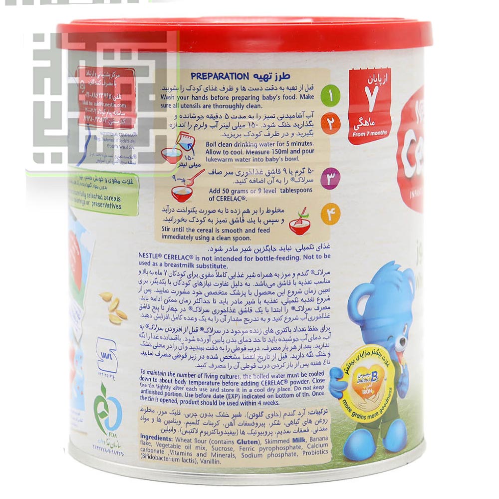 سرلاک گندم و موز نستله به عنوان غذای کمکی کودکان 12 ماه به بالا محسوب می شود. قبل از تهیه سرلاک، دست ها و ظرف غذای کودک خود را کاملا بشویید.