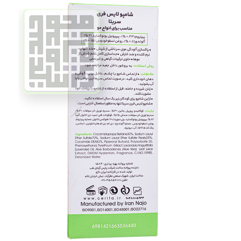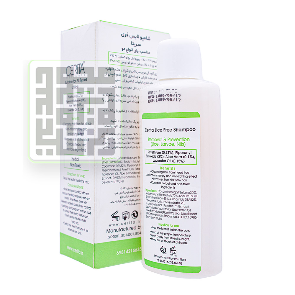 شامپو ضد شپش لایس فری سریتا یک محصول بهداشتی و دارای مواد مفید گیاهی و طبیعی برای مرگ شپش و ازبینبردن تخمهای آنها است. شامپو ضد شپش لایس فری دارای ویژگیهای منحصربهفردی از جمله پاکسازی آلودگی موی سر ناشی از شپش، جداسازی کامل تخم شپش از موها، نرمکننده، ضد خارش، ضدالتهاب و حاوی ترکیبات گیاهی غیرسمی شامل روغن اسطوخودوس و آلوئهورا برای انواع موها و محافظت از موها است.