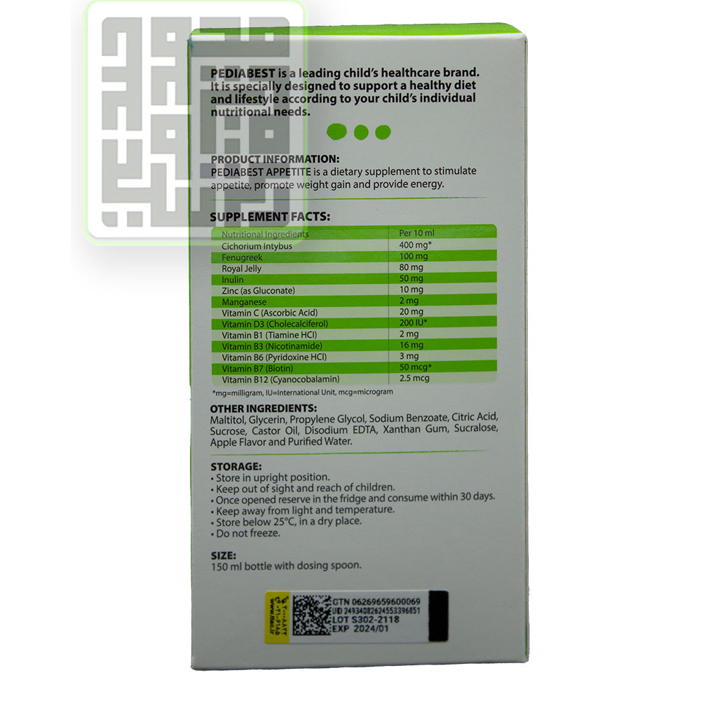 شربت اشتها آور اپتایت پدیابست یک فرآورده مکمل دارویی و غذایی است. این شربت یک محصول اشتهاآور برای کودکان و بزرگسالان بوده که شامل عصاره ترکیبات گیاهی است. این محصول فاقد گلوتن و الکل بوده و دارای طعم مطلوب و مناسب با ذائقه کودکان است. شربت اشتها آور اپتایت پدیابست علاوه بر اشتهاآور بودن موجب تقویت سیستم ایمنی بدن می‌شود.