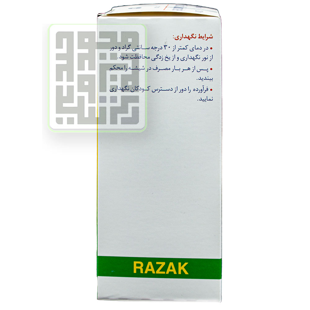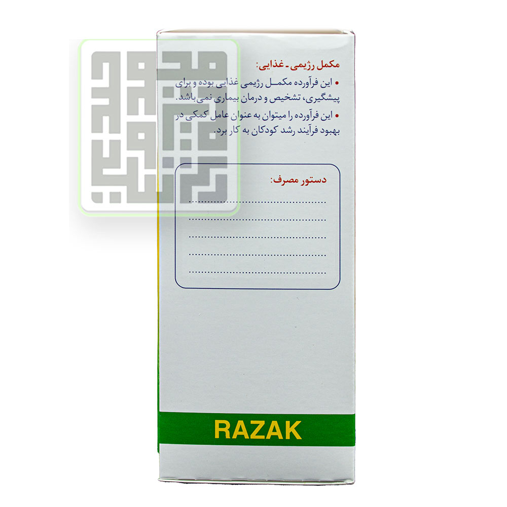شربت زینک سولفات رازک یک مکمل غذایی شامل مواد معدنی ضروری بدن است. این شربت دارای طعم مطلوب و مناسب با ذائقه کودکان بوده و از طعمدهندههای طبیعی استفاده شده است. همچنین فاقد گلوتن و لاکتوز است که محصول را مناسب برای افراد مبتلا به سلیاک میکند.