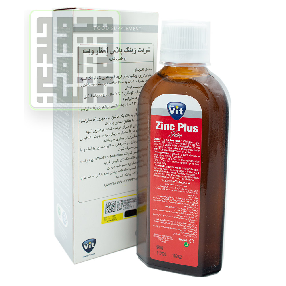 شربت زینک پلاس استار ویت یک فرآورده مکملی است. شامل مواد معدنی مانند روی و ویتامینهای گروه ب و ویتامین ث است، میتوان نیاز روزانه بدن برای کودکان و نوجوانان، سالمندان و حتی با بانوان شیرده و باردار مناسب است. به دلیل وجود عناصر و مواد معدنی و ویتامینهای موجود در این شربت باعث بهبود و کمک بهسلامت پوست، مو، ناخن، بهبود و کمک بهسلامت سیستم ایمنی بدن، تقویت رشد جسمی و ذهنی، پیشگیری و کاهش سرماخوردگی، تقویت حافظه و افزایش رشد قدی و تقویت اشتهای کودکان بسیار مناسب است.