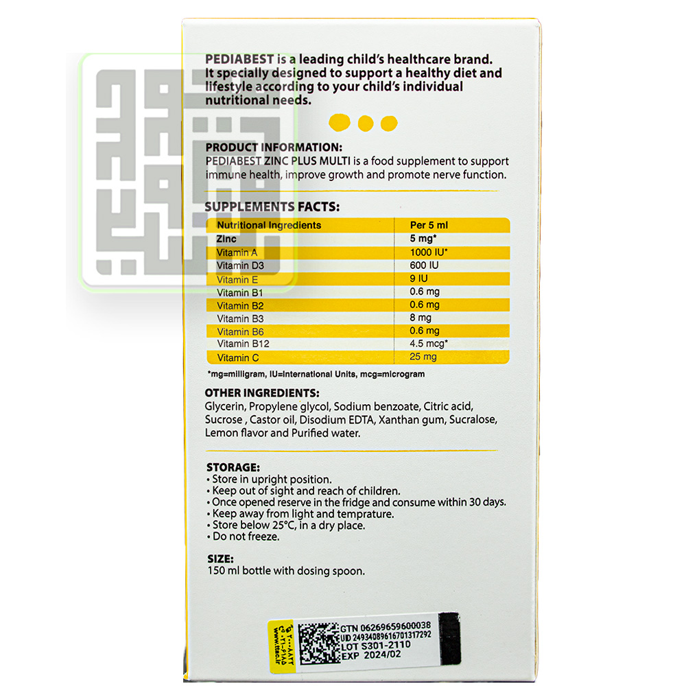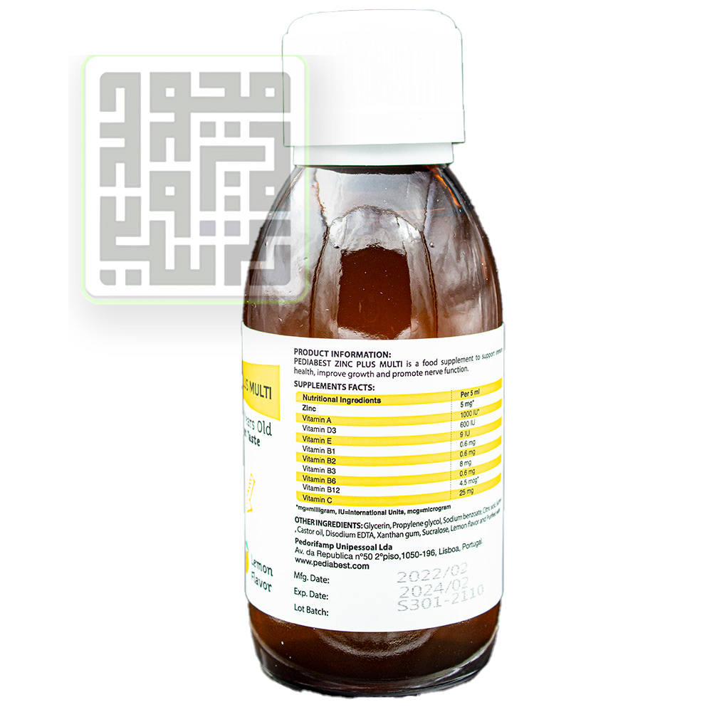 شربت زینک پلاس مولتی پدیا بست 150 میلی لیتر یک مکمل تغذیهای برای کودکان بالای 2 سال است که به تأمین ویتامینها و مواد مغذی موردنیاز بدن آنها کمک میکند. این شربت حاوی مقادیر بالایی از زینک، ویتامینهای A، D، E، C، گروه B و اسیدفولیک است. استفاده از این مکمل به افزایش اشتها، بهبود رشد و افزایش توان سیستم ایمنی کمک بسزایی کرده و ویتامین A و D موجود در آن موجب تکامل چشم و ذهن میشود. شربت زینک پلاس مولتی پدیا بست 150 میلی لیتر دارای طعمدهنده لیمو بوده و فاقد رنگ مصنوعی است.