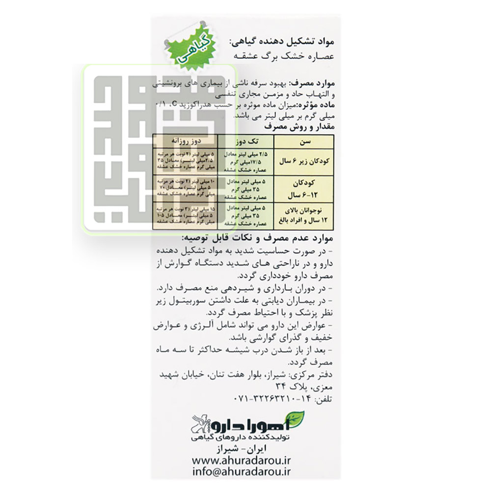 - عصاره خشک برگ عشقه (هر میلیلیتر شربت حاوی ۷ میلیگرم برگ گیاه عشقه)