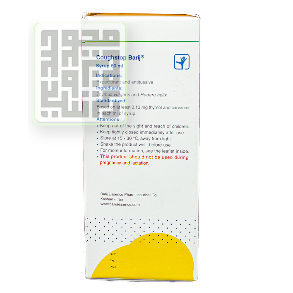 شربت کاف استاپ باریج حاوی عصاره گیاهان ضد سرفه عشقه و آویشن است، همچنین دارای ماده تیمول بوده که در درمان سرفههای خلط دار برای رفع بیماریهای تنفسی اثرگذار است. این شربت برای شیرخواران و کودکان مناسب و مورد قبول است، زیرا از هیچگونه رنگ و طعمدهنده مصنوعی در آن استفاده نشده است.