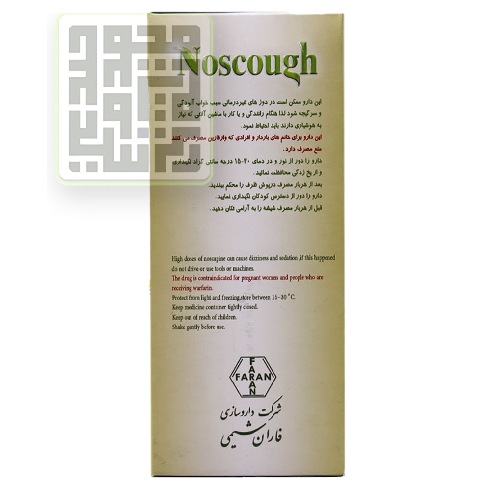 شربت ضد سرفه نوسکاف فاران شیمی حاوی 100 میلیلیتر بوده و از ماده نوسکاپین و شیرینبیان تهیه شده که هر دو گیاه با خاصیت ضدالتهابی و ضدباکتریایی خود در درمان سرماخوردگی، برونشیت، سیاهسرفه، آنفولانزا و آلرژی مؤثر هستند. این شربت گیاهی بسیار قوی بوده و شدت و مدت سرفه را کاهش میدهد. ماده نوسکاف زیر مجموعه ماده خشخاش است، این ماده مسیرهای مربوط به سرفه را در مغز پیدا کرده و اثرات خود را اعمال میکند. همچنین شیرینبیان یک ماده با خاصیت ضدالتهابی قوی است که میتواند بهبود سریع در کاهش علائم بیماری داشته باشد.