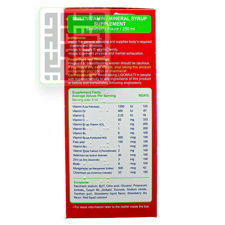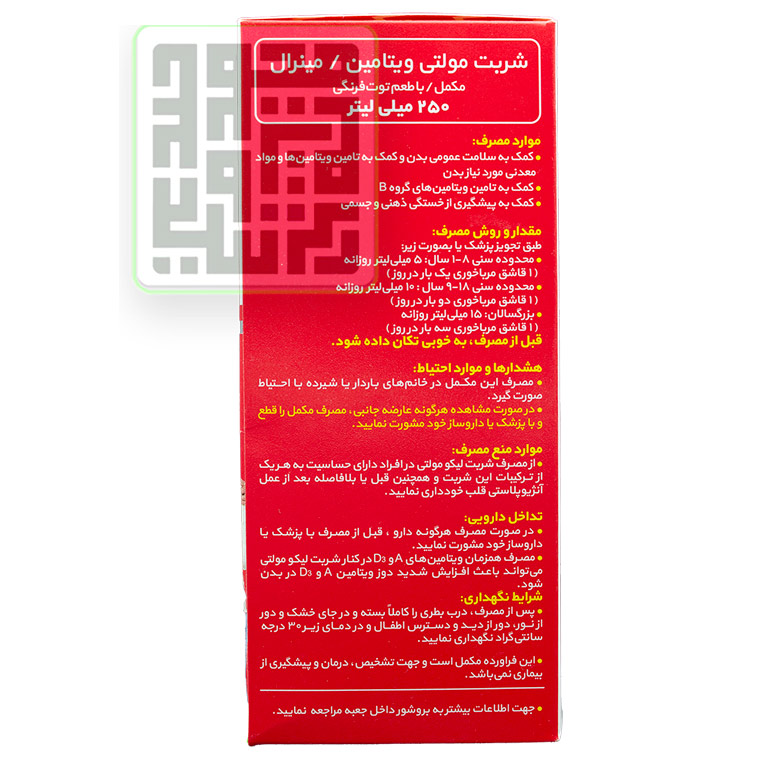 این شربت یک فرآورده مکملی شامل مواد معدنی و ویتامینهای ضروری بدن است. این مکمل مناسب با همه گروههای سنی بوده و در آن از طعمدهندههای طبیعی استفاده شده و مناسب با ذائقه کودکان است. این مکمل فاقد هرگونه رنگهای مصنوعی، گلوتن و لاکتوز است. شربت مولتی ویتامین لیکو مولتی ابیان فارمد 250 میلی لیتر برای حفظ سلامت عمومی بدن و پیشگیری از خستگی ذهنی و جسمی مناسب بوده و موجب رشد و عملکرد طبیعی بدن کودکان، تقویت سیستم ایمنی و همچنین سلامت بینایی و حفظ سلامت پوست و مو و استحکام ناخنها میشود.