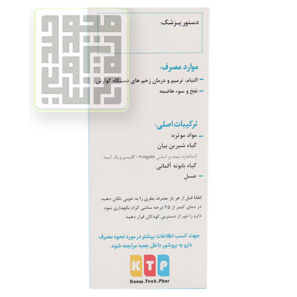 ترکیبات اصلی موجود در آن که شامل شیرین بیان و بابونه آلمانی هستند و اثر این دوماده باهم در درمان اسپاسم و التهابات دستگاه گوارش همگی مورد تایید کمیسیون E آلمان می باشند.