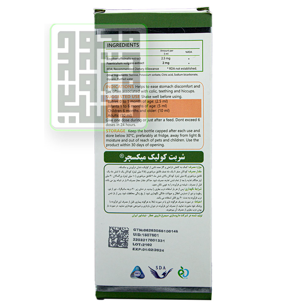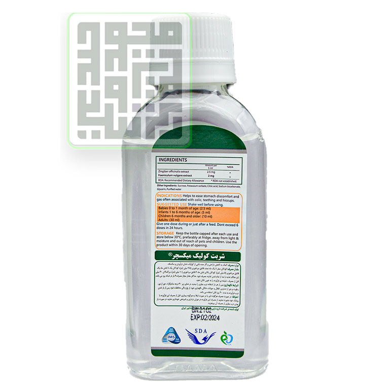 شربت کولیک میکسچر(120میلی لیتر) ساخته شرکت سیمرغ دارو بوده و این شرکت دو عصاره مهم گیاهی زنجبیل و رازیانه را باهم ترکیب کرده است. میوه رازیانه سبب کاهش یا توقف اسپاسم­‌های دستگاه گوارش می‌شود و در نتیجه غذا راحت‌تر هضم شده و زنجبیل نیز سبب کاهش ترشح اسید معده می شود.