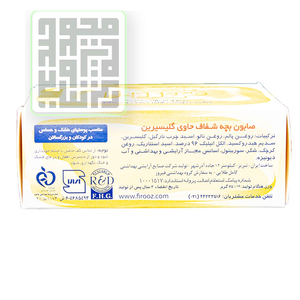 صابون بچه گلیسیرنه فیروز ، محصولی بسیار ملایم جهت شستشوی پوستهای حساس و خشک کاربرد دارد. خاصیت نرم کنندگی و پاک کنندگی این محصول بسیار عالی میباشد.