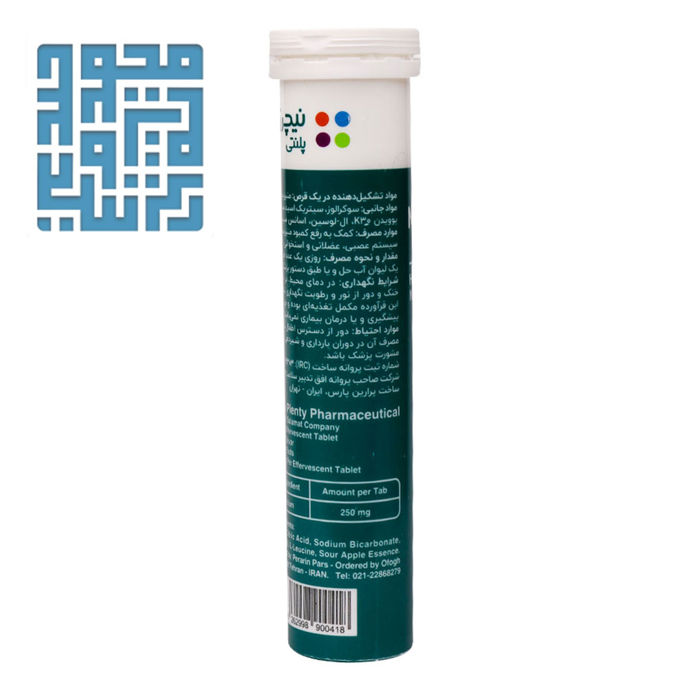 قرص جوشان منیزیم نیچرز پلنتی یک مکمل جوشان حاوی 250 میلی گرم منیزیم در هر قرص جوشان است که دارای طعم سیب ترش است.