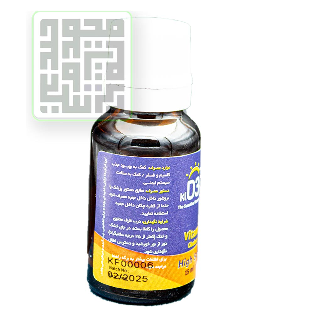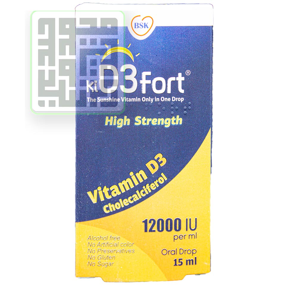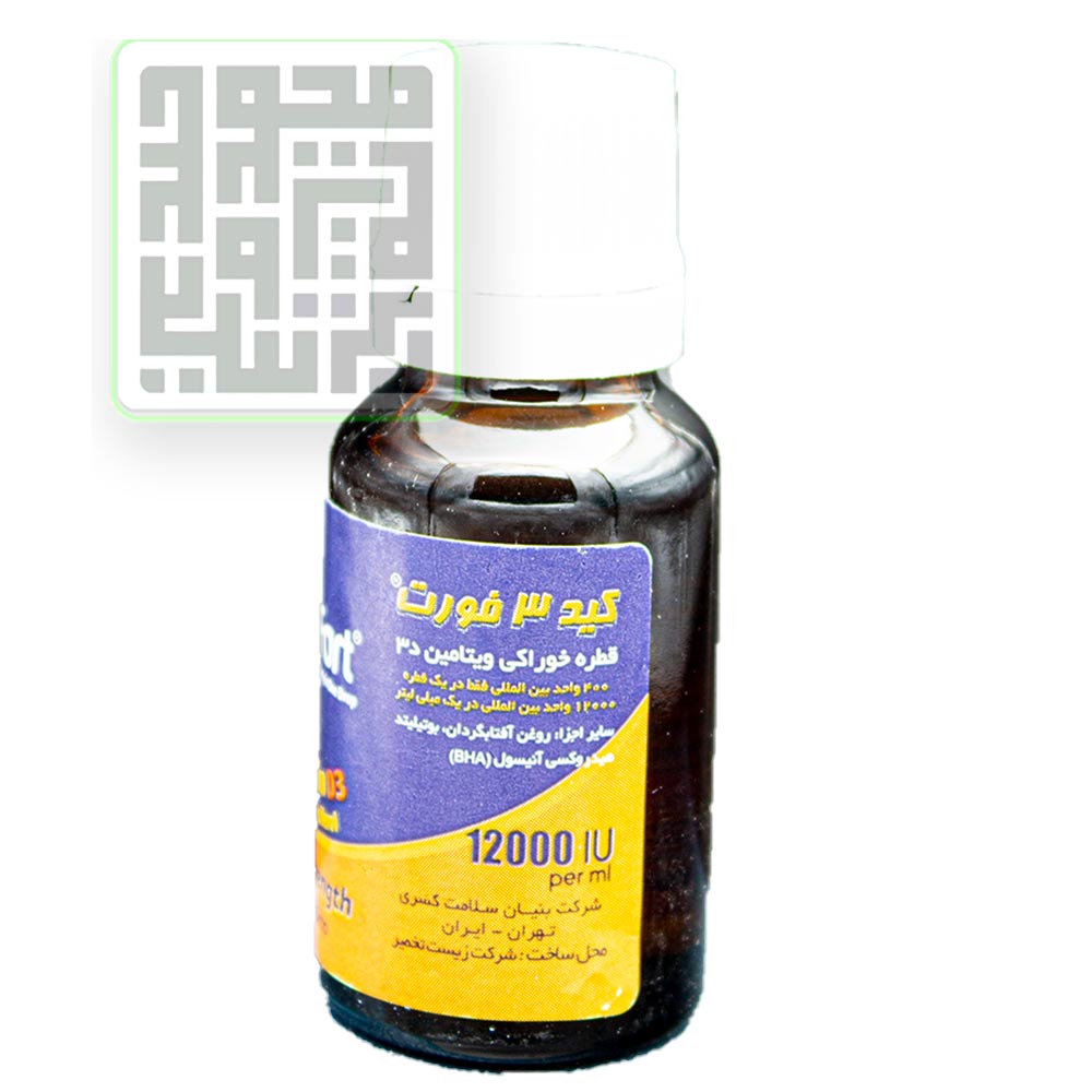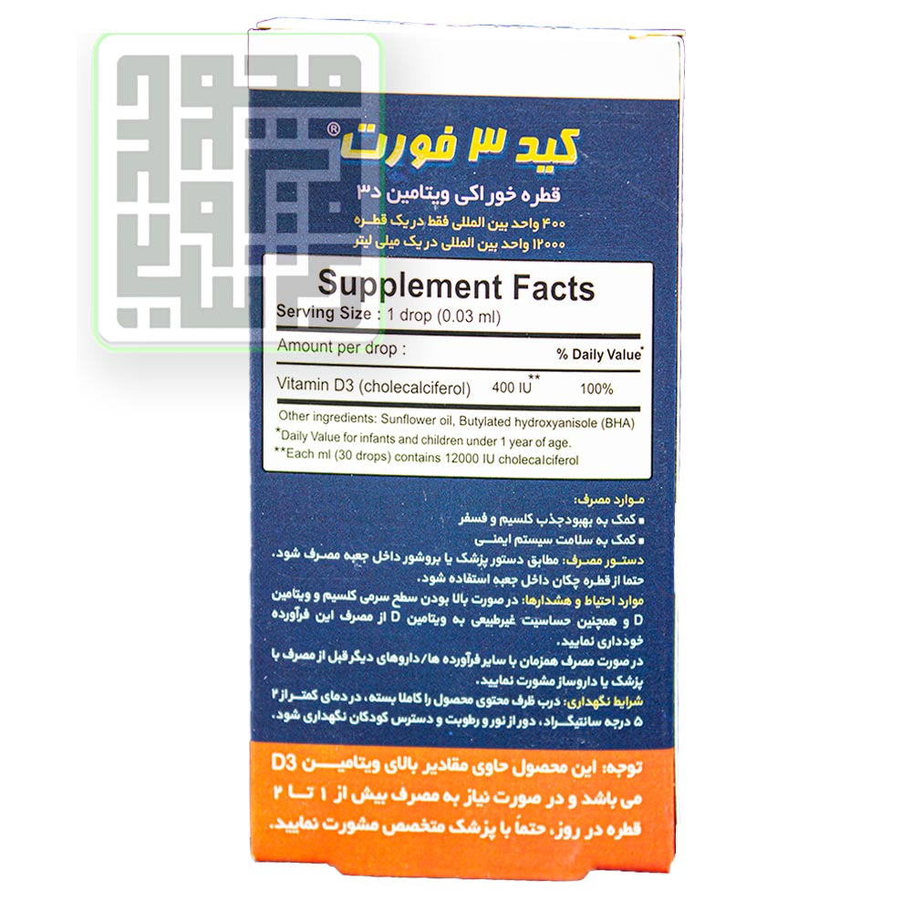 قطره ویتامین د3 کید 3 فورت حاوی 400 واحد ویتامین D3 در یک قطره و 12000 واحد ویتامین D3 در یک سیسی است.