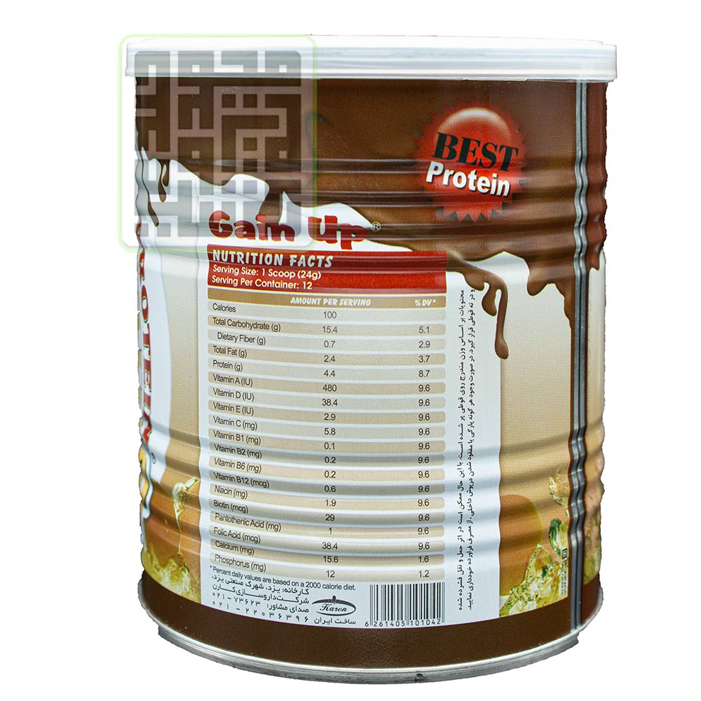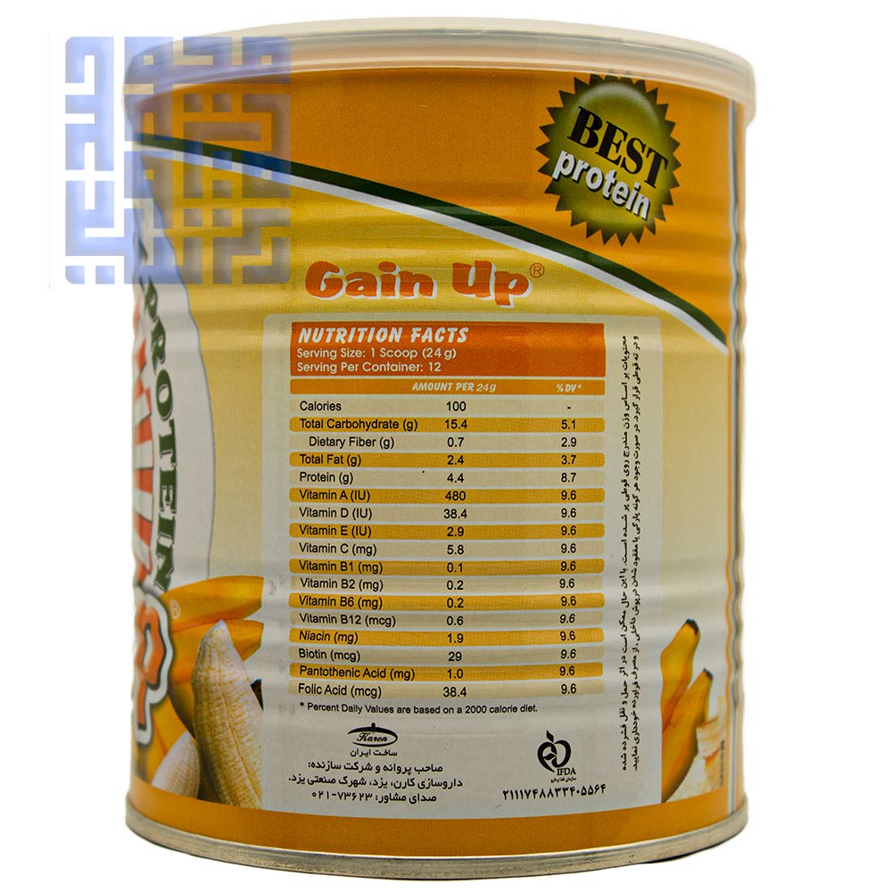 ترکیبات موجود در پودر گین آپ در هر وعده 24 گرمی شامل کربوهیدرات ها، فیبر، چربی، پروتئین و طیف وسیعی از ویتامین ها است.