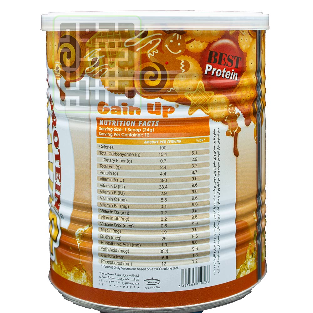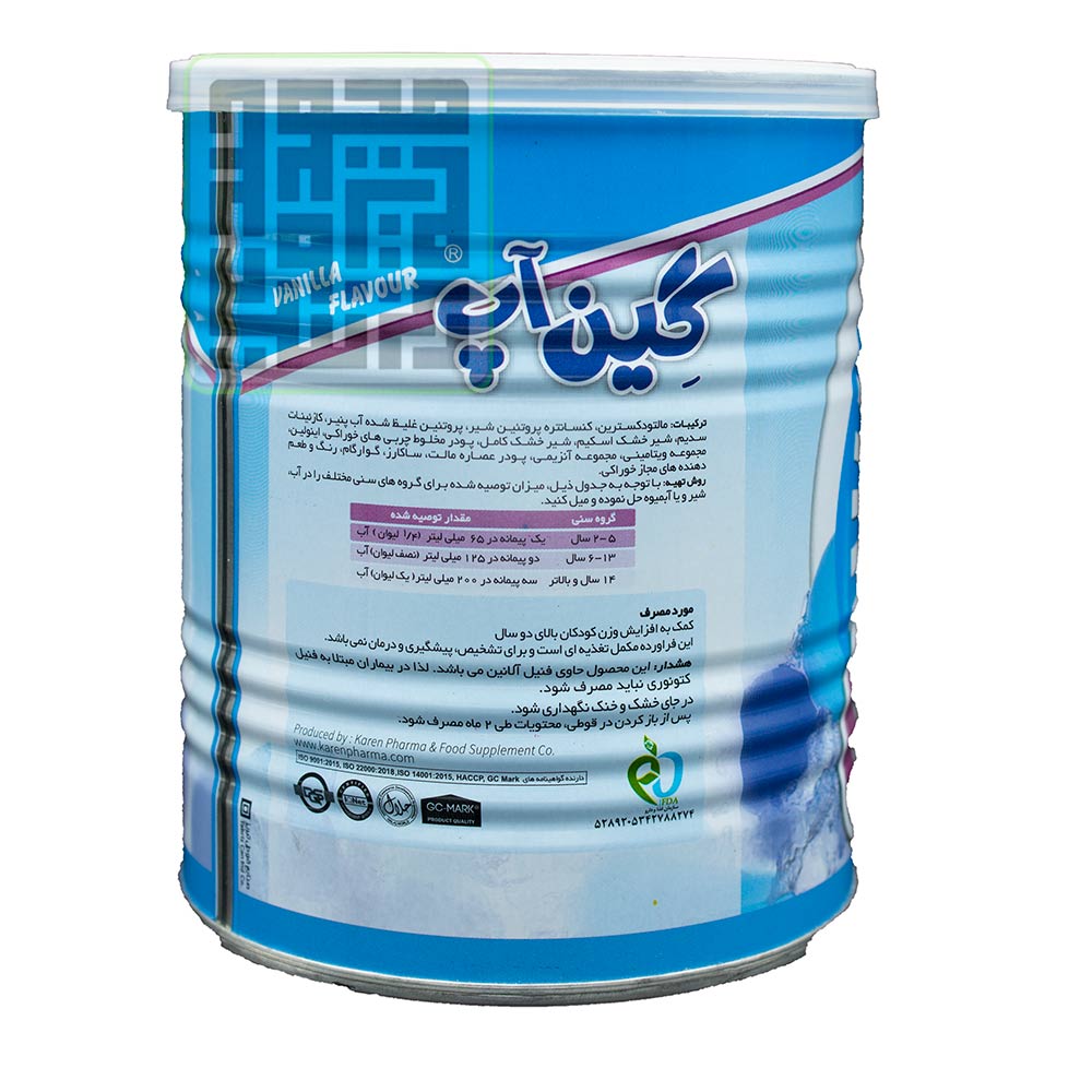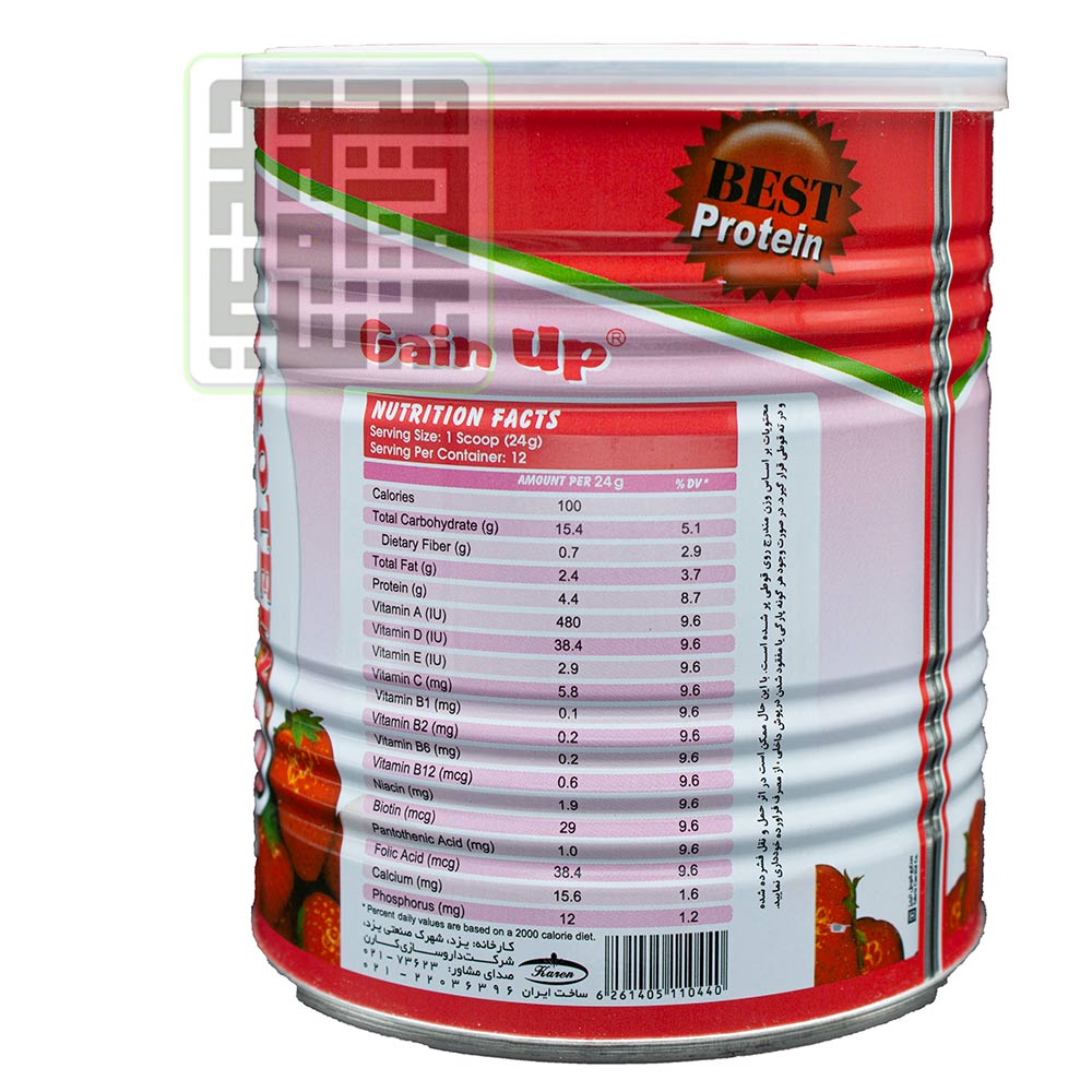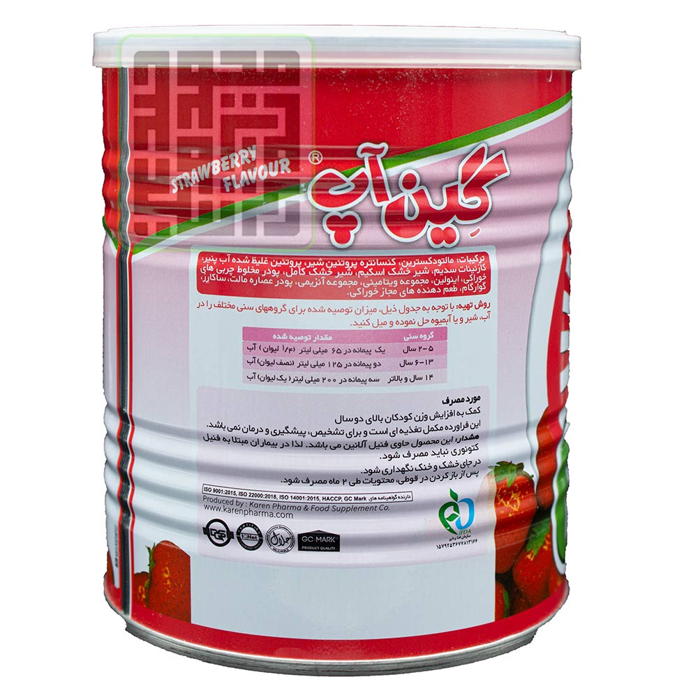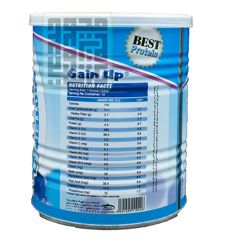 گین آپ 12 نوع ویتامین برای تأمین نیاز روزانه دارد. این محصول کم لاکتوز است. به افزایش وزن کودکان بی اشتها، لاغر و بدغذا کمک میکند. همچنین، در کودکان کموزن و دچار سوءتغذیه و کودکانی که نمیتوانند تنها از طریق غذا نیاز خود را تامین کنند، به تامین انرژی روزانه و پروتئین کمک میکند.