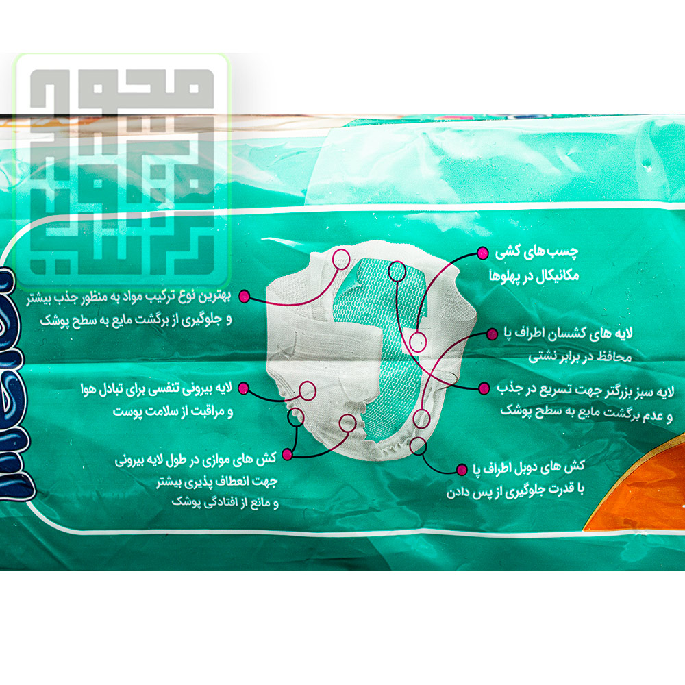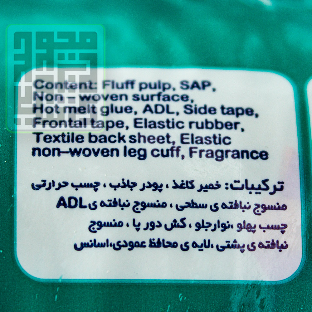 چسبهای استفاده شده در قسمت پهلو از نوع مکانیکال بوده و دارای عملکرد و چسبندگی مناسبی است. استفاده از این نوع چسب باعث افزایش امینت خاطر برای والدین عزیز شده است.