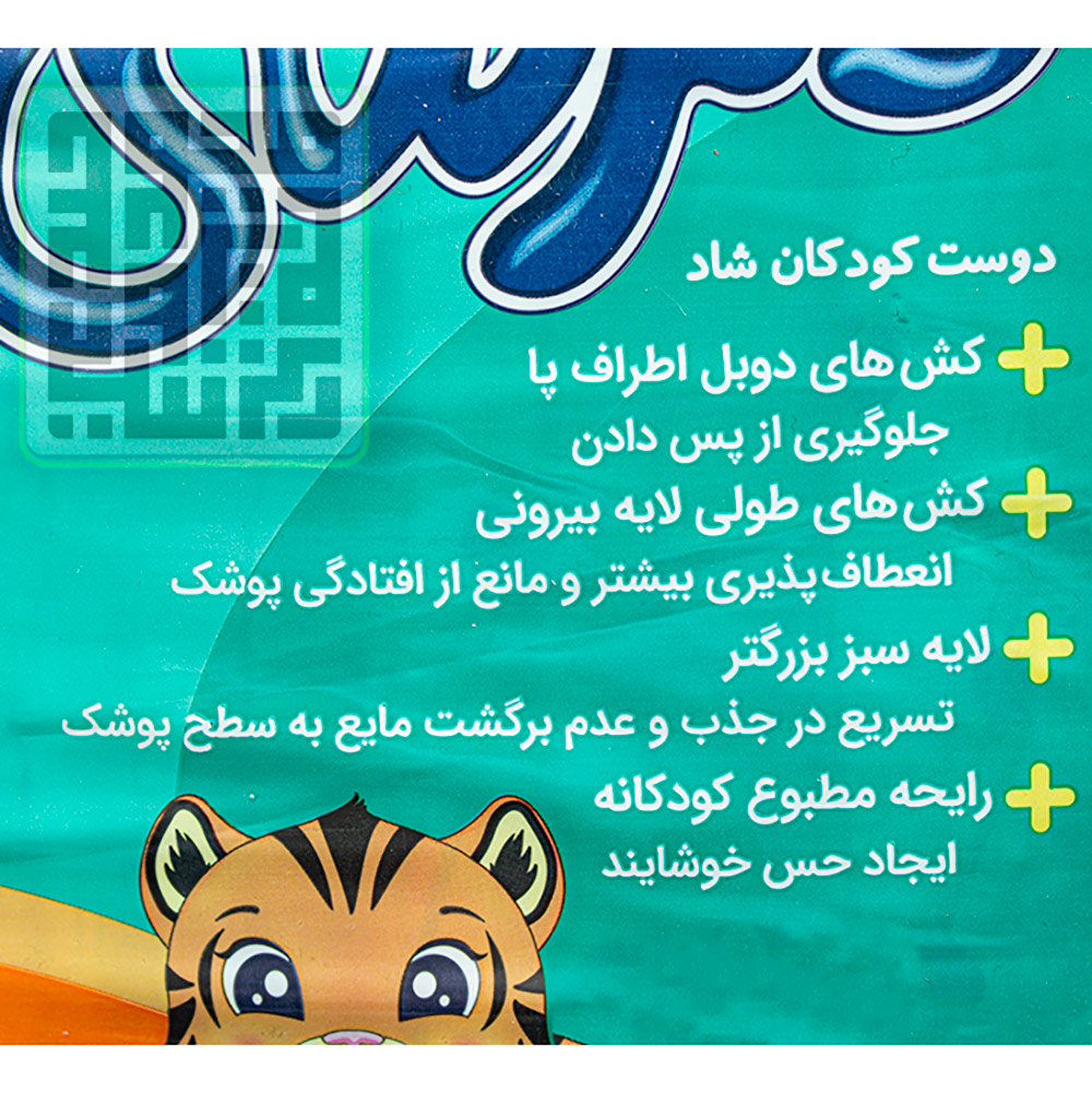 این محصول بر خلاف دیگر انواع پوشک موجود در بازار که دارای طراحی یکنواخت و ساده هستند ، دارای طرح پلنگی سبز بوده و با دیگر محصولات کاملا متفاوت میباشد. این محصول دارای خاصیت تغییر رنگ است و بعد از کثیف شدن و یا برخورد با رطوبت ، تغییر رنگ میدهد.