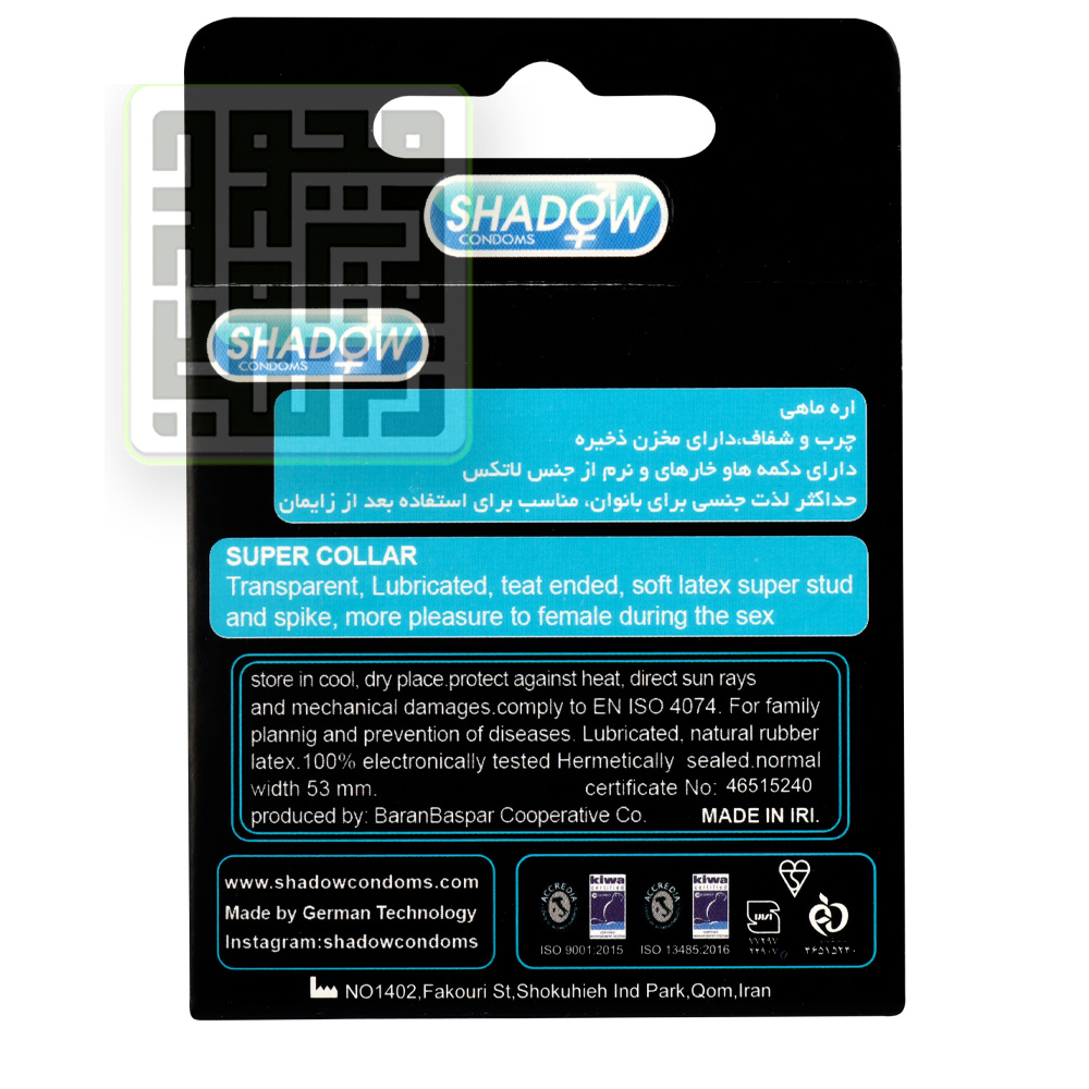 برند کاندوم شادو (Shadow) یکی از شرکت‌های بزرگ تولید کننده کاندوم در ایران بوده که دارای تنوع بسیار بالایی از نظر نوع محصول است. این موضوع سبب افزایش محبوبیت آن شده.