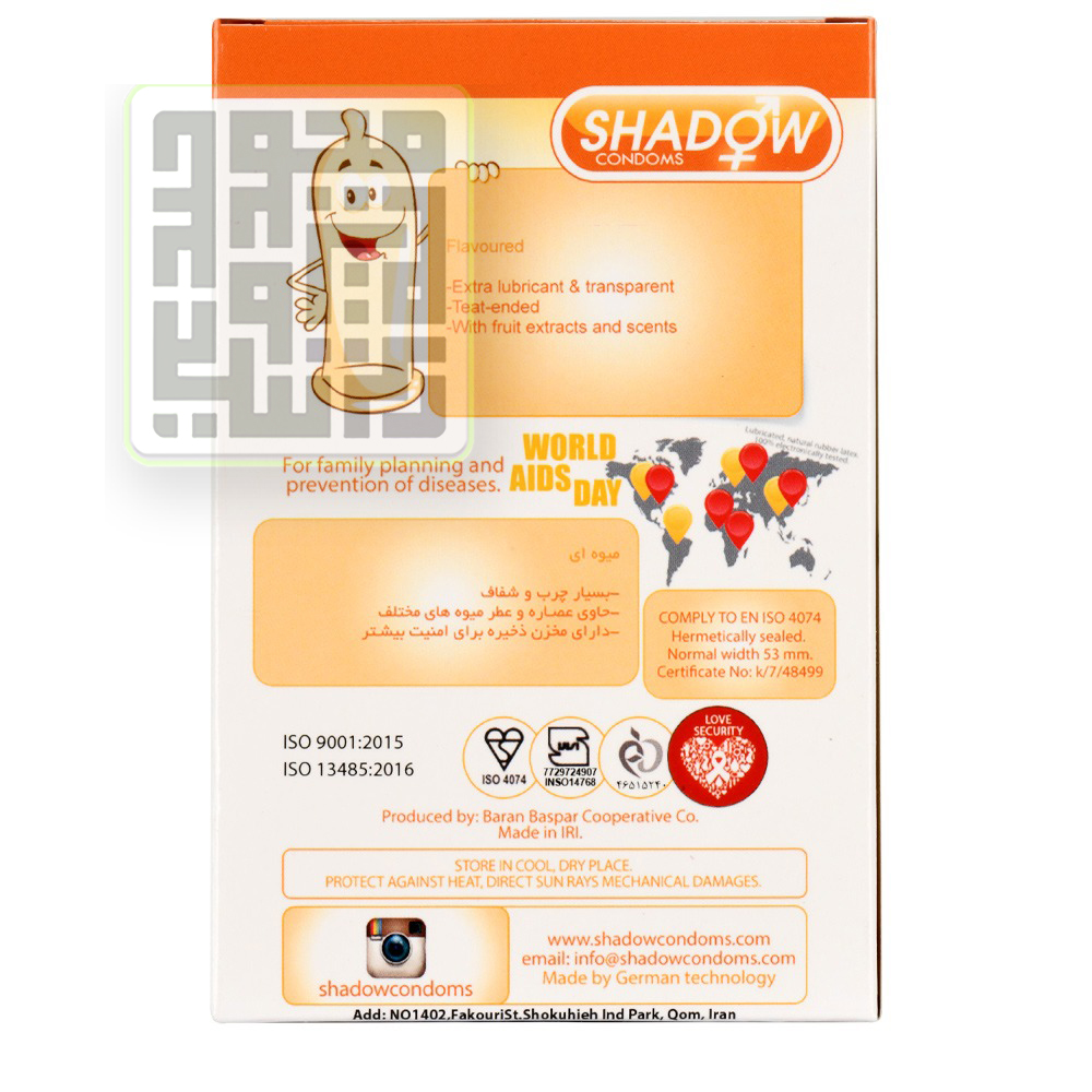 برند کاندوم شادو (Shadow) یکی از شرکتهای بزرگ تولید کننده کاندوم در ایران بوده که دارای تنوع بسیار بالایی از نظر نوع محصول است. این موضوع سبب افزایش محبوبیت آن شده.