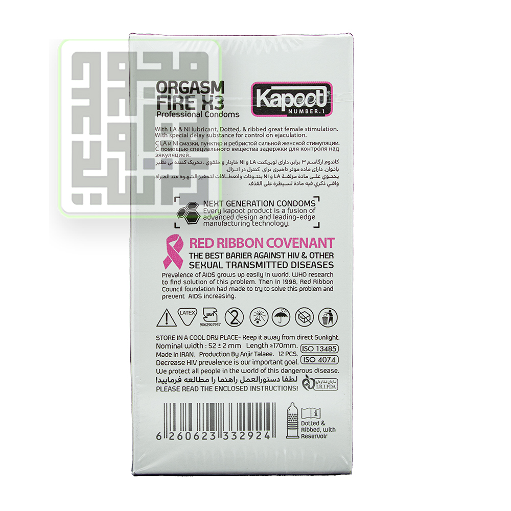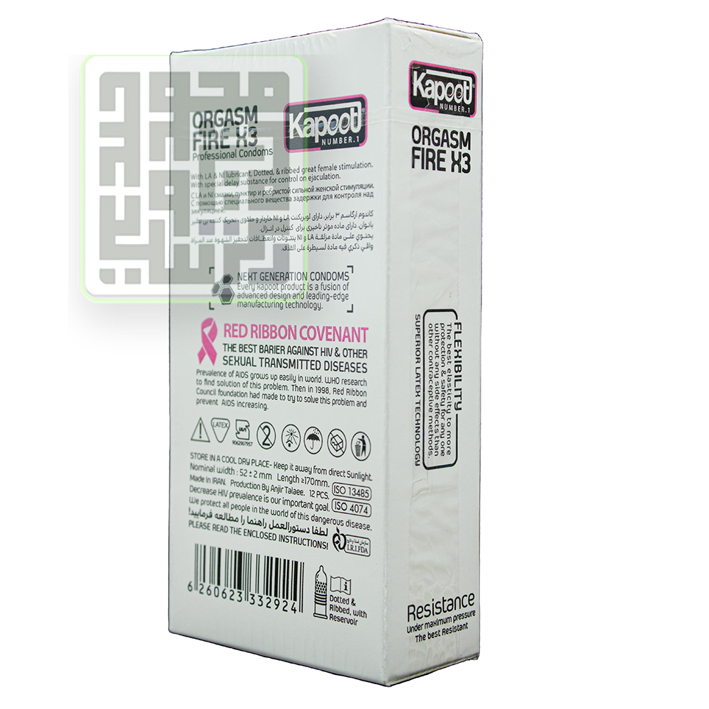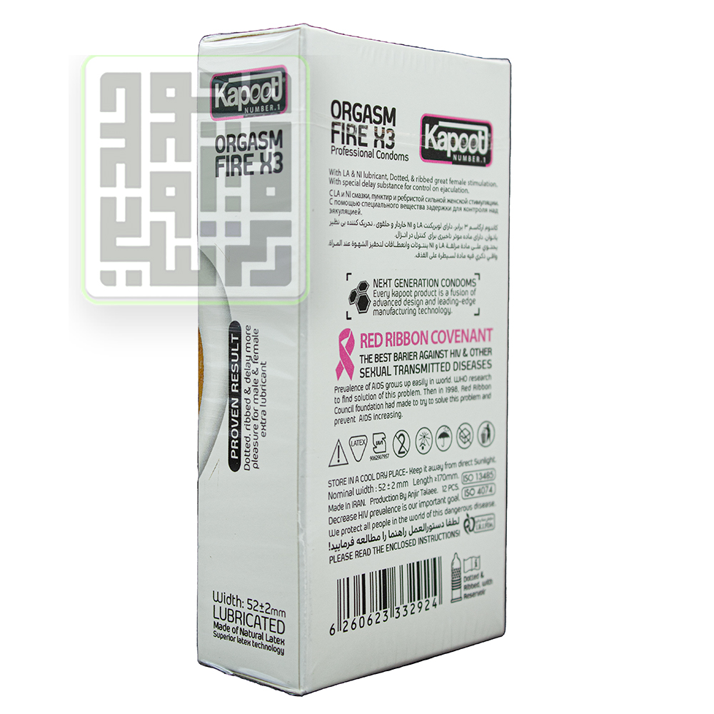 کاندوم کاپوت مدل ORGASM FIRE X3  ارگاسم سه برابر یکی از کاندوم‌های برند کاپوت است. کاندوم کاپوت ORGASM FIRE X3 برابری جزو محصولات ترکیبی برند کاپوت محسوب می‌شود که دارای کیفیت بسیار بالایی است. همچنین به دلیل داشتن خاصیت ترکیبی ، دارای چندین خواص مختلف بوده که باعث افزایش لذت در حین رابطه می‌شود.