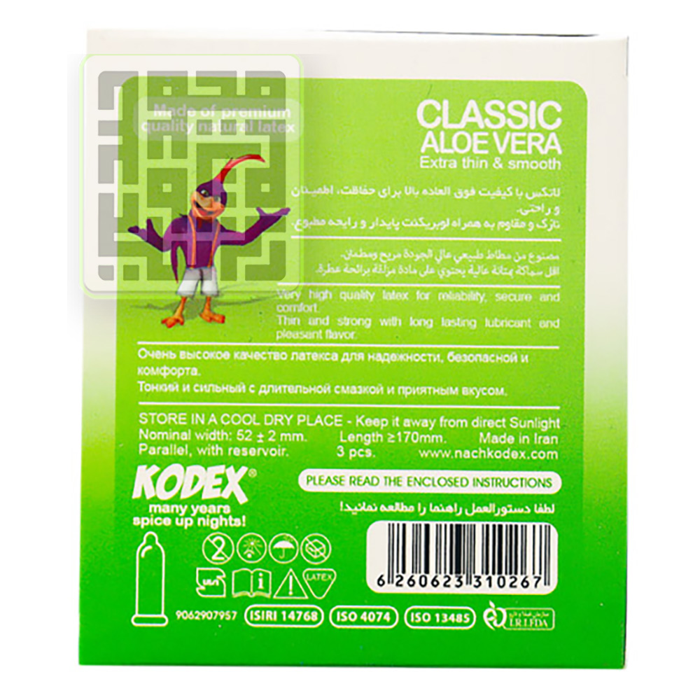 ویژگیهای کاندوم کدکس مدل Classic Aloe Vera بسته 3 تایی