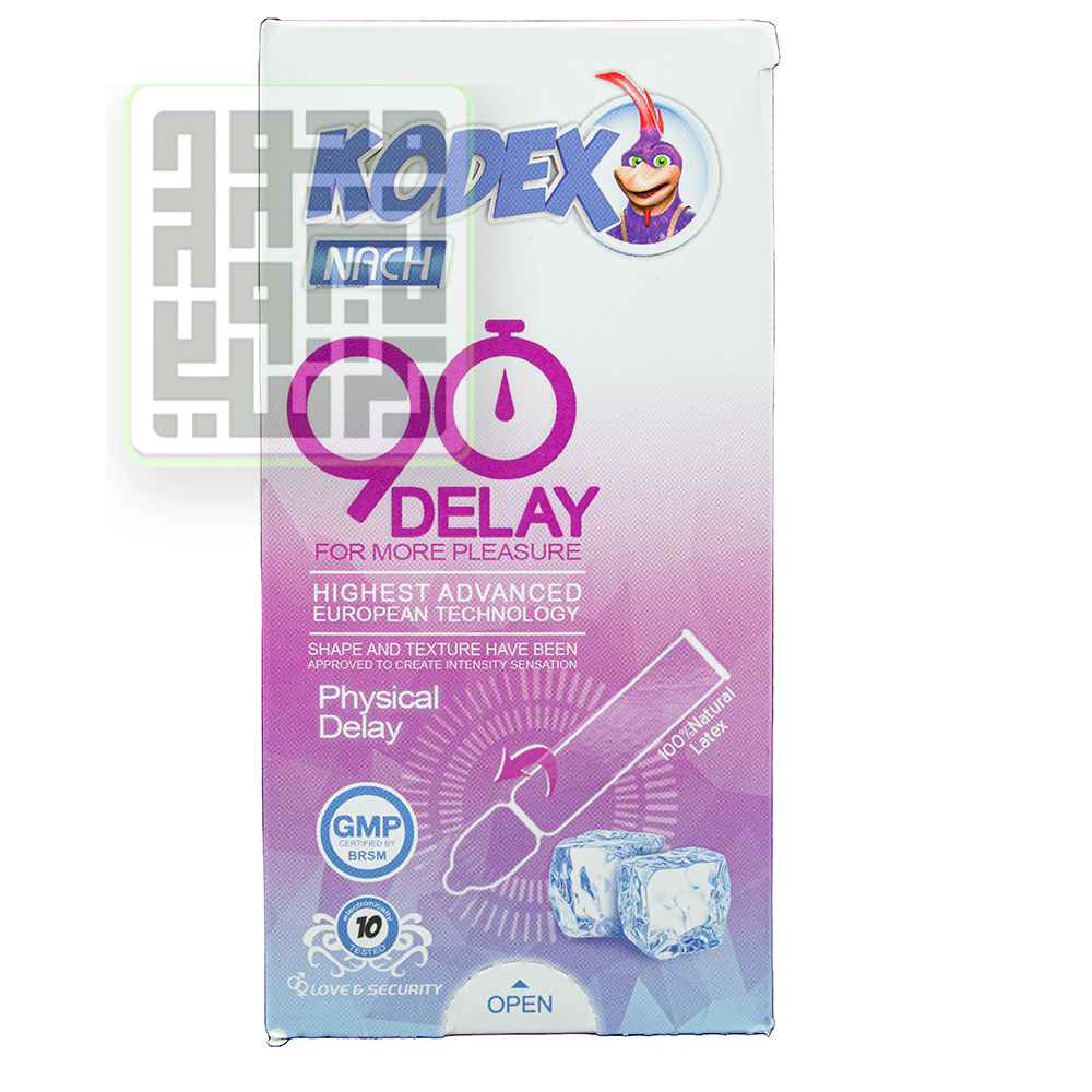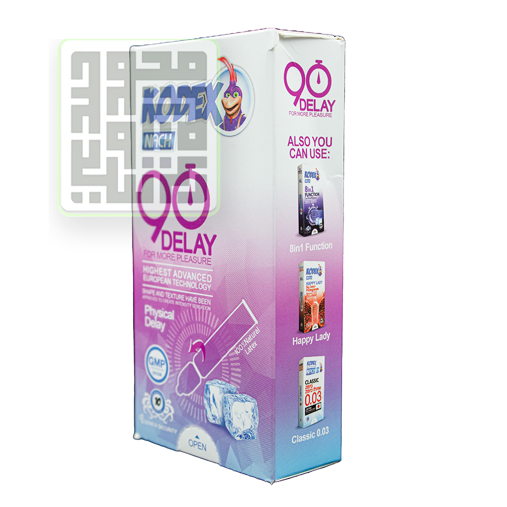 کاندوم کدکس Delay 90 تاخیری بسته 12 تایی یکی دیگر از محصولات برند ناچ کدکس یا کدکس است. که انحصارا برای این شرکت میباشد.