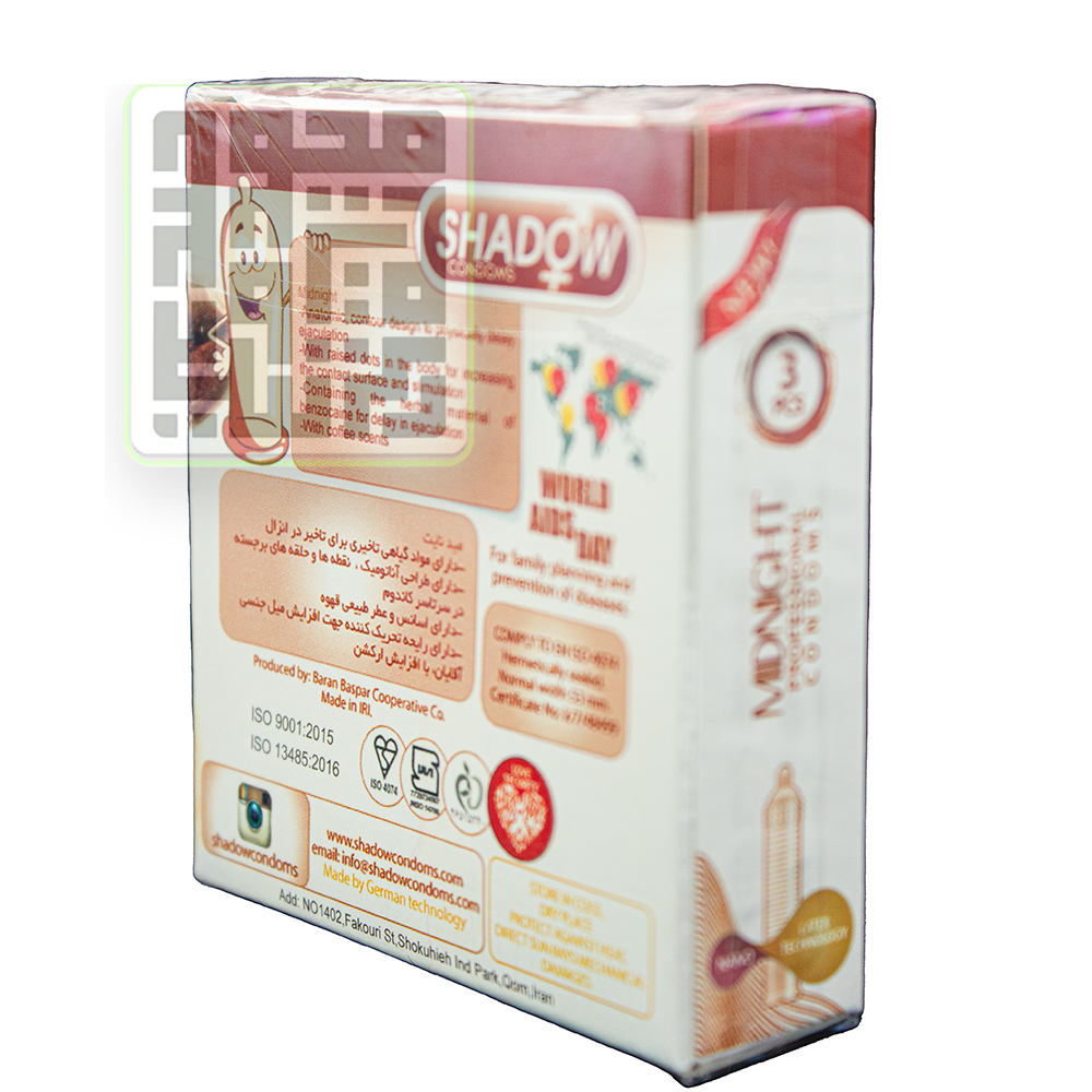 کاندوم شادو مدل MIDNIGHT بسته 3 تاییکاندومی تولید شده توسط برند شادو (Shadow) است که دارای چندیدن خاصیت منحصر به فرد میباشد. وجود چند خاصیت در یک محصول سبب بالا رفتن کارایی و محبوبیت آن شد است.