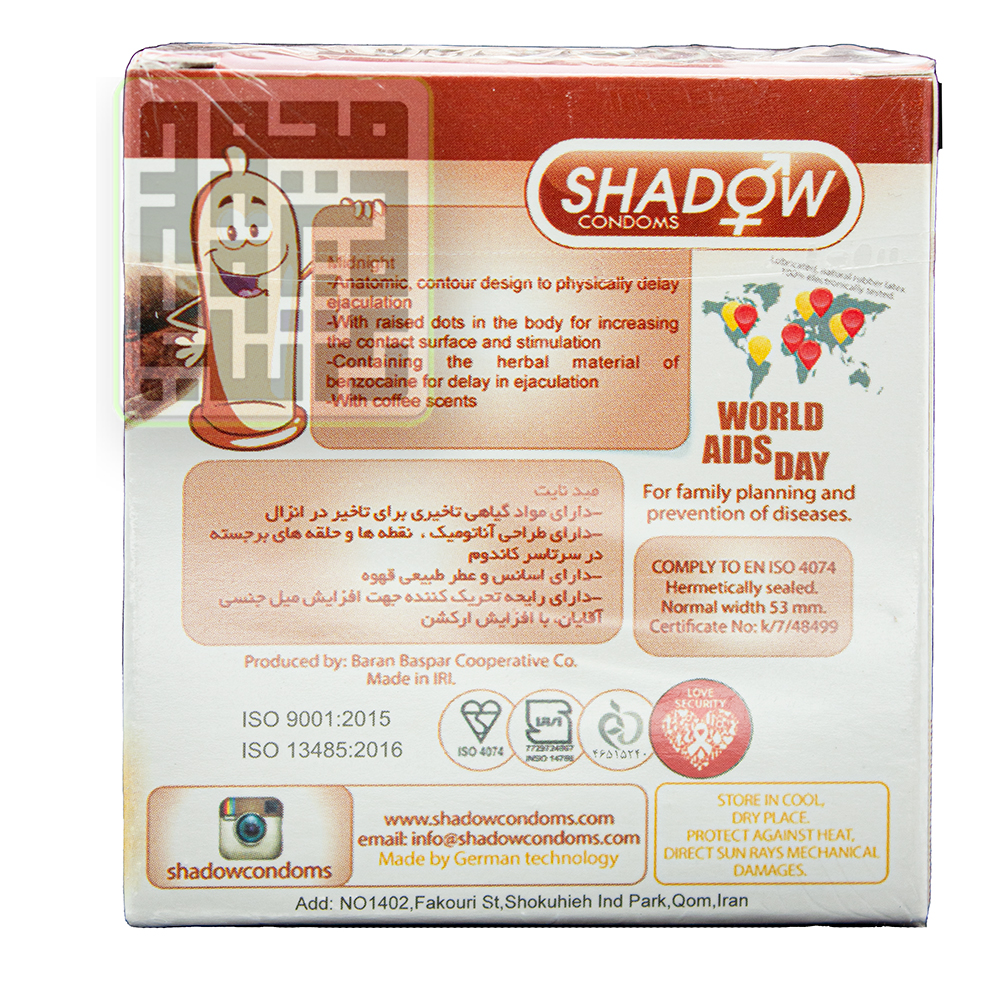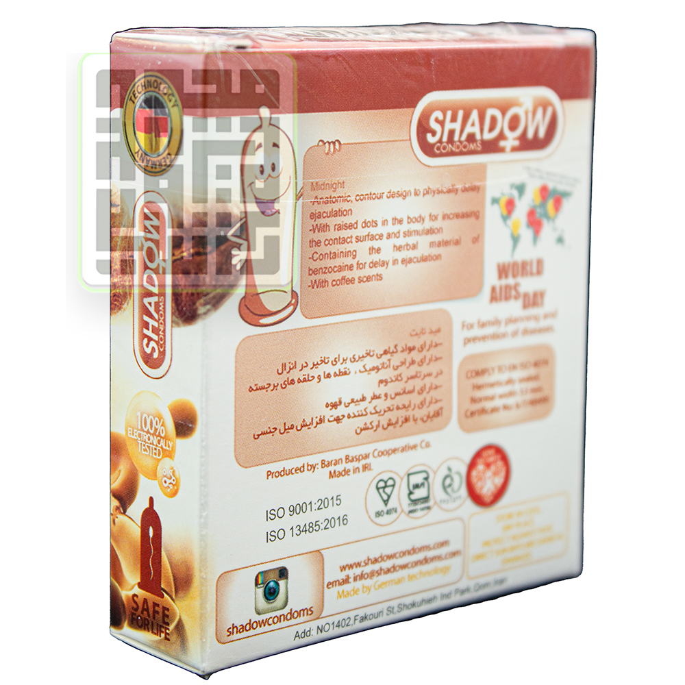 برند کاندوم شادو (Shadow) یکی از شرکتهای بزرگ تولید کننده کاندوم در ایران بوده که دارای تنوع بسیار بالایی از نظر نوع محصول است. این موضوع سبب افزایش محبوبیت آن شده.