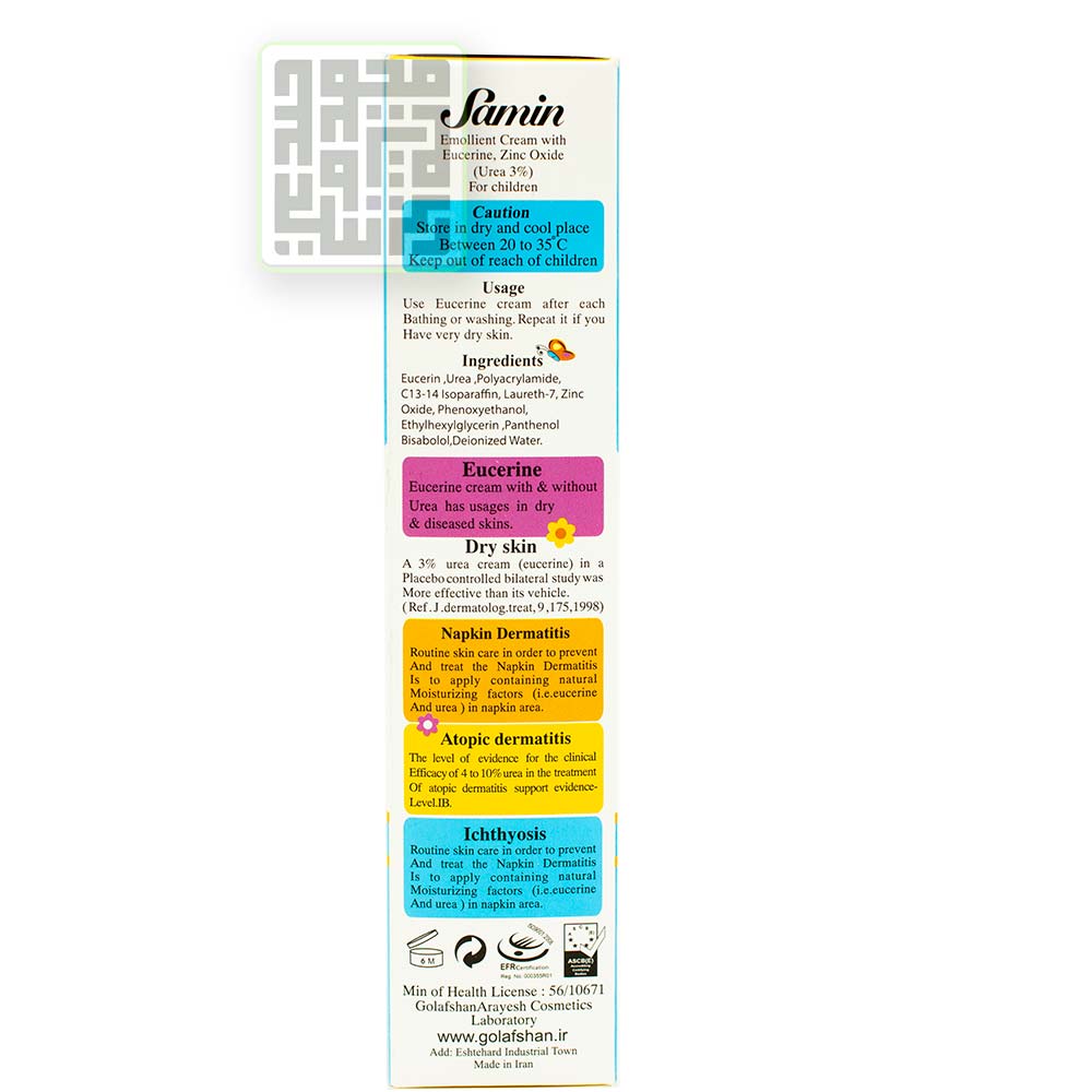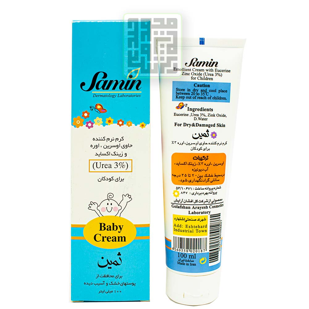 کرم نرم کننده ثمین با بهرهمندی از فرمولاسیون متناسب با پوست نوزادان و کودکان تولید گردیده و با برخورداری از اوره و فاکتورهای طبیعی مرطوبکننده پوست (NMFs) که به طور طبیعی در ساختار پوست حضور دارند، موجب افزایش توان حفظ رطوبت در لایه شاخی پوست گردیده و تبخیر آب از سطح پوست (TEWL) را کاهش میدهد. همچنین بیزابولول مورد استفاده موجب نرمی، کاهش التهاب و علایم ناشی از انواع درماتیت، درماتیت آتوپیک و اگزما میگردد.