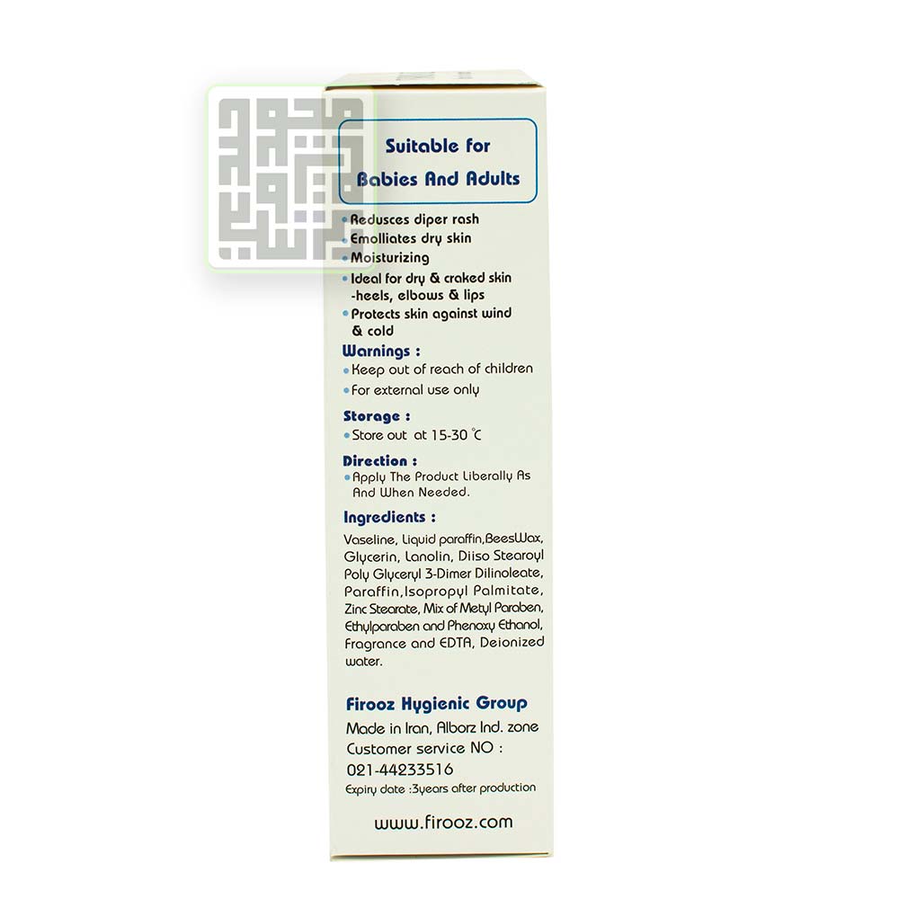 وازلین مخصوص کودکان فیروز به دلیل داشتن بافت سبک و قدرت جذب بالا، بهراحتی روی پوست پخش شده و یک سد محافظ طبیعی ایجاد میکند. این لایه محافظ، مانع از دست رفتن رطوبت پوست در برابر شرایط آبوهوایی نامناسب شده و پوست را برای مدت طولانی نرم و لطیف نگه میدارد.