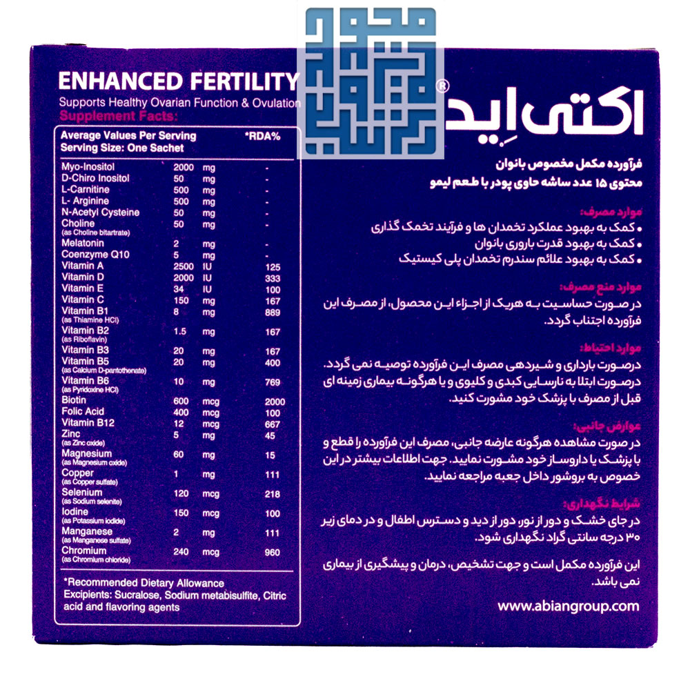 ساشه اکتی اید بانوان ابیان دارو چیست؟ مکملی خوراکی است که با تامین ریزمغذیهای حیاتی و آنتیاکسیدانهای مؤثر، به بهینهسازی عملکرد تخمدان و افزایش توان باروری در بانوان کمک میکند. ترکیب علمی و هدفمند آن به گونهای تنظیم شده تا از تعادل طبیعی بدن پشتیبانی کرده و شرایط ایدهآلی برای لقاح فراهم آورد.