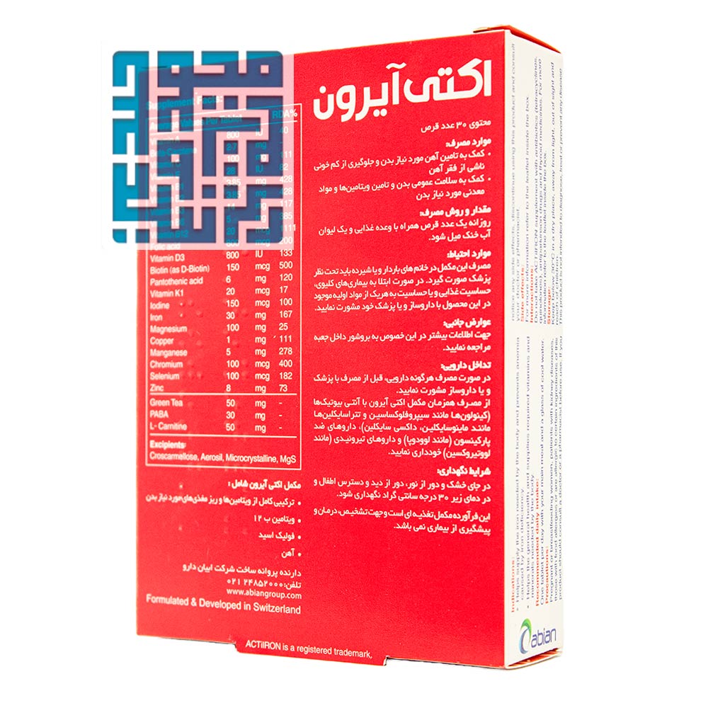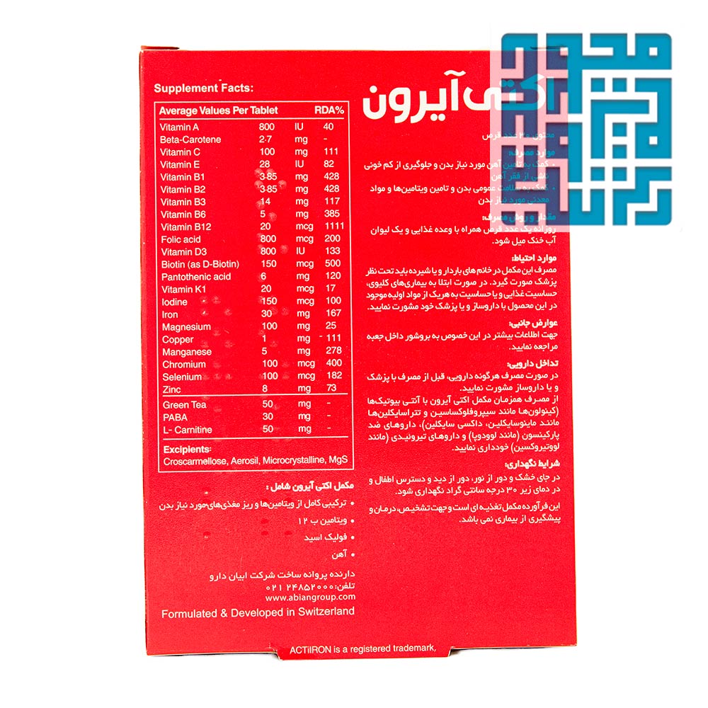 قرص اکتی آیرون ابیان دارو یک مکمل کمخونی بسیار مناسب بوده و شامل ویتامینهای گروه ب، ویتامین آ، ویتامین ث، مس، آهن، کرومیوم، سلنیوم و منیزیم است. این مکمل همچنین برای تقویت توان فیزیکی بانوان و بهبود روند بارداری آنها مؤثر خواهد بود. مصرف این قرص حتماً باید طبق دستور پزشک باشد و برای مقدار دوز مصرفی و زمان مصرف آن هم حتماً باید با پزشک خود مشورت کنید.