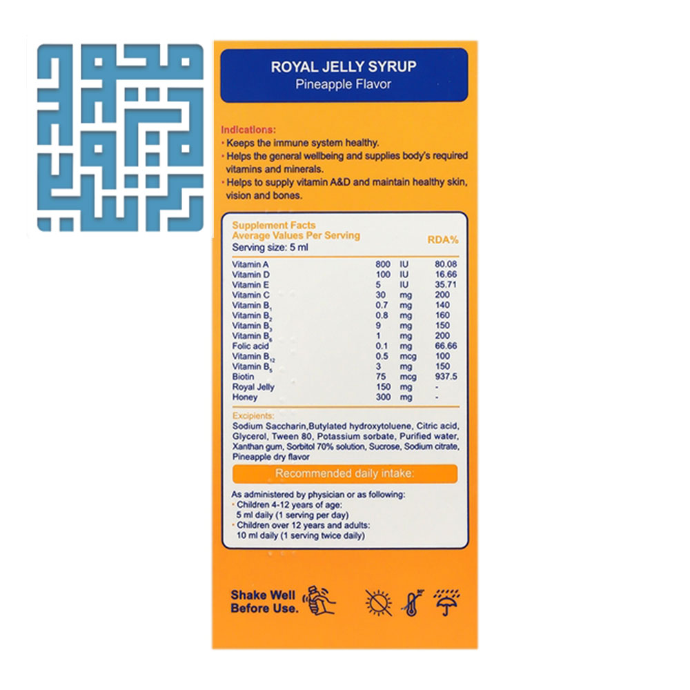 این شربت شامل ترکیباتی نظیر رویال ژلی، عسل، ویتامینهای A، C، D، E و گروه B (B1، B2، B3، B6، B9، B12، B5، B7) است. هر یک از این ترکیبات در تأمین انرژی، تقویت سیستم ایمنی، بهبود رشد کودکان و افزایش سلامت عمومی بدن نقش مهمی ایفا میکنند.