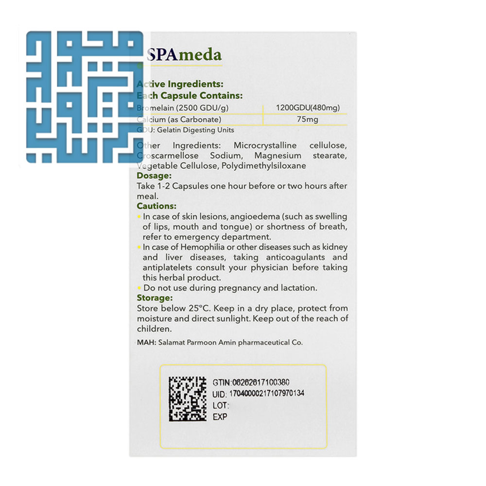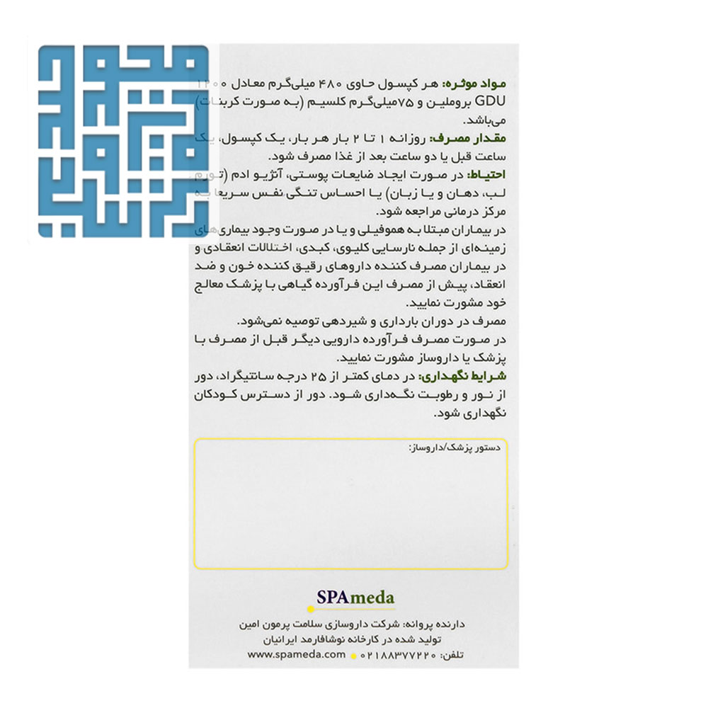 هر کپسول حاوی 1200GDU بروملین و 75 میلی گرم کلسیم