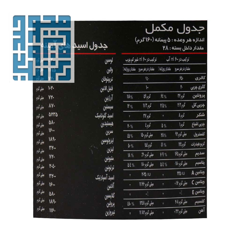 میباشد. هر وعده مصرفی حاوی 950 کیلوکالری انرژی و 59 گرم پروتئین با ارزش بیولوژیکی بالا است.