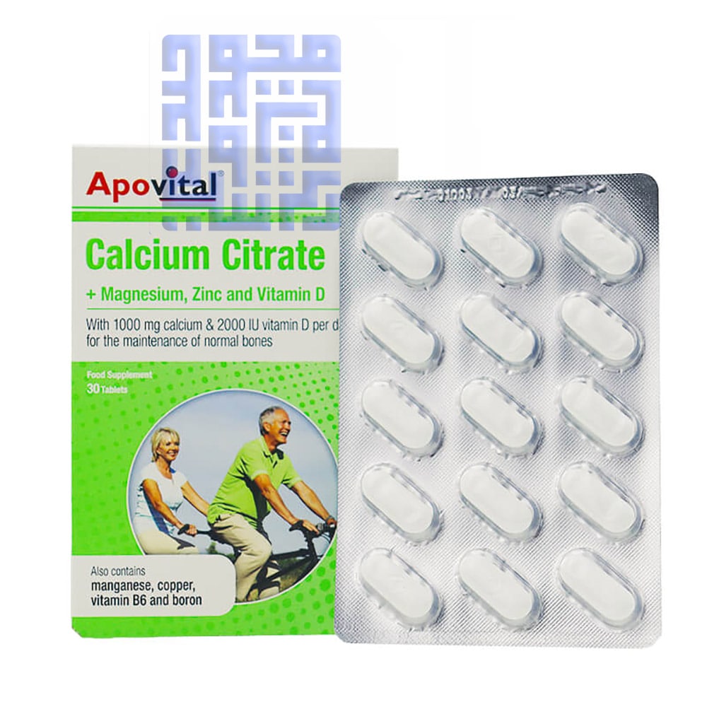 کلسیم موجود در قرص های کلسیم سیترات آپوویتال به شکل سیترات کلسیم بوده که در مقایسه با سایر اشکال مانند کربنات کلسیم به راحتی در دستگاه گوارش جذب می شود. همچنین مکمل های کلسیم برای سلامت استخوان، انتقال اعصاب و عملکرد عضلات مهم است. سیترات کلسیم به ویژه برای افرادی که اسید معده پایینی دارند یا کسانی که از داروهای کاهش دهنده اسید استفاده می کنند، مفید است.