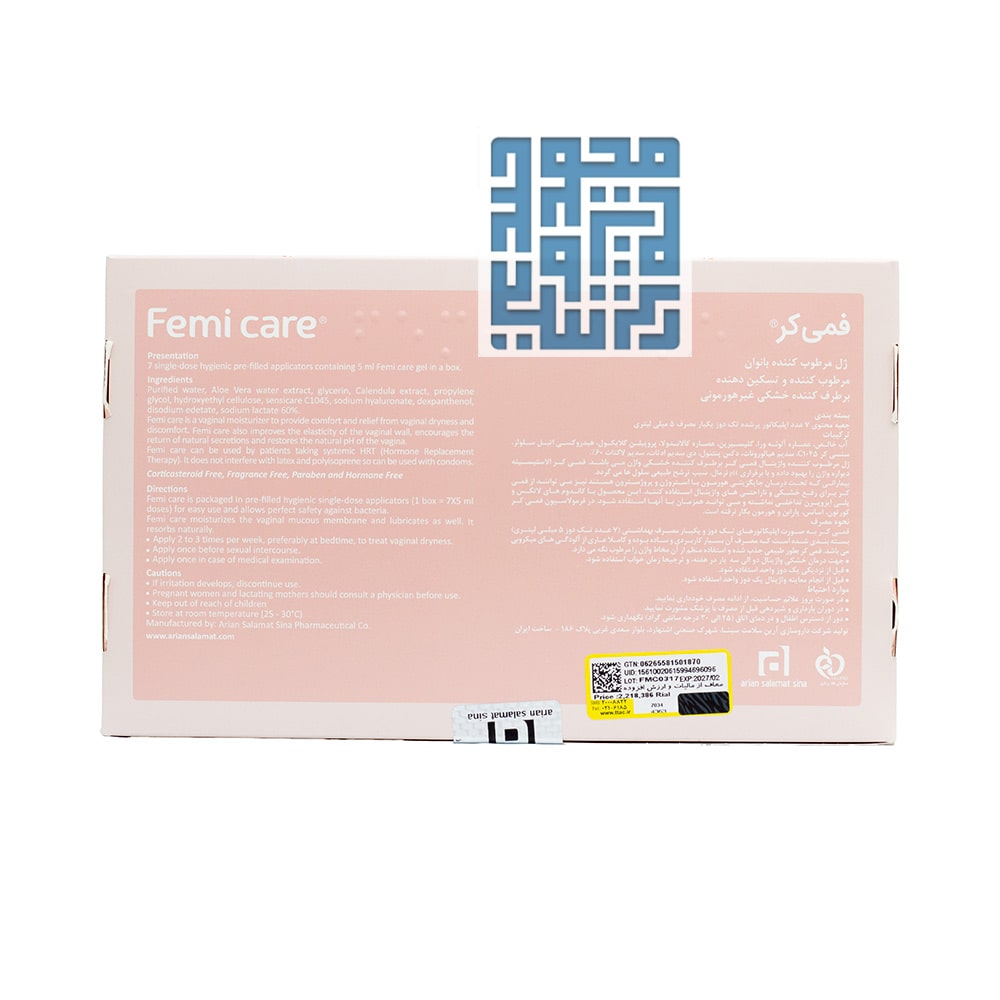 ژل فمی کر آرین سلامت سینا به عنوان یک رطوبترسان غیر هورمونی فرموله شده تا به بهبود خشکی و آسیبهای سطحی در ناحیه واژن کمک کند.