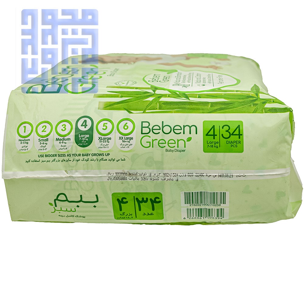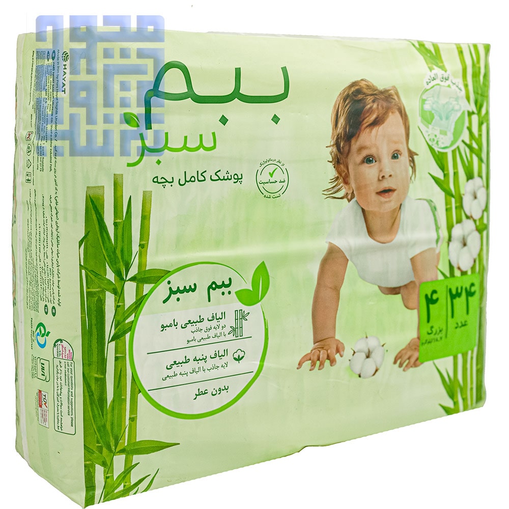 پوشک ببم سبز سایز 4 دوبل محصولی اقتصادی از برند Bebem است. پس از موفقیت برند مولفیکس، برند دوم شرکت حیات کیمیا با نام ببم شکل گرفت. در واقع این سری از پوشک ، ابتدا در کشور ترکیه تولید میشد اما امروزه در ایران (شهرک صنعتی ابهر) تولید میشود.