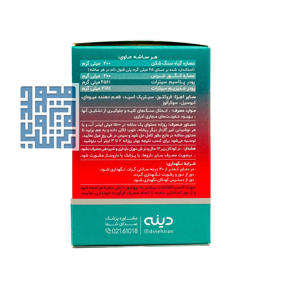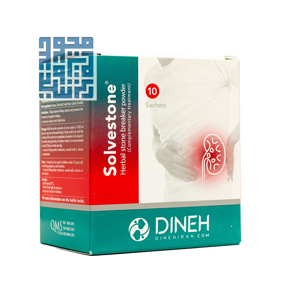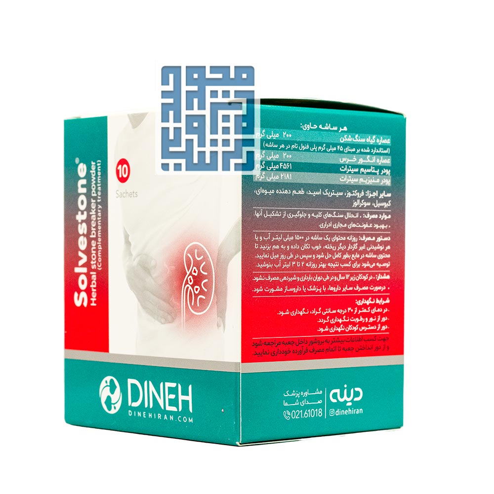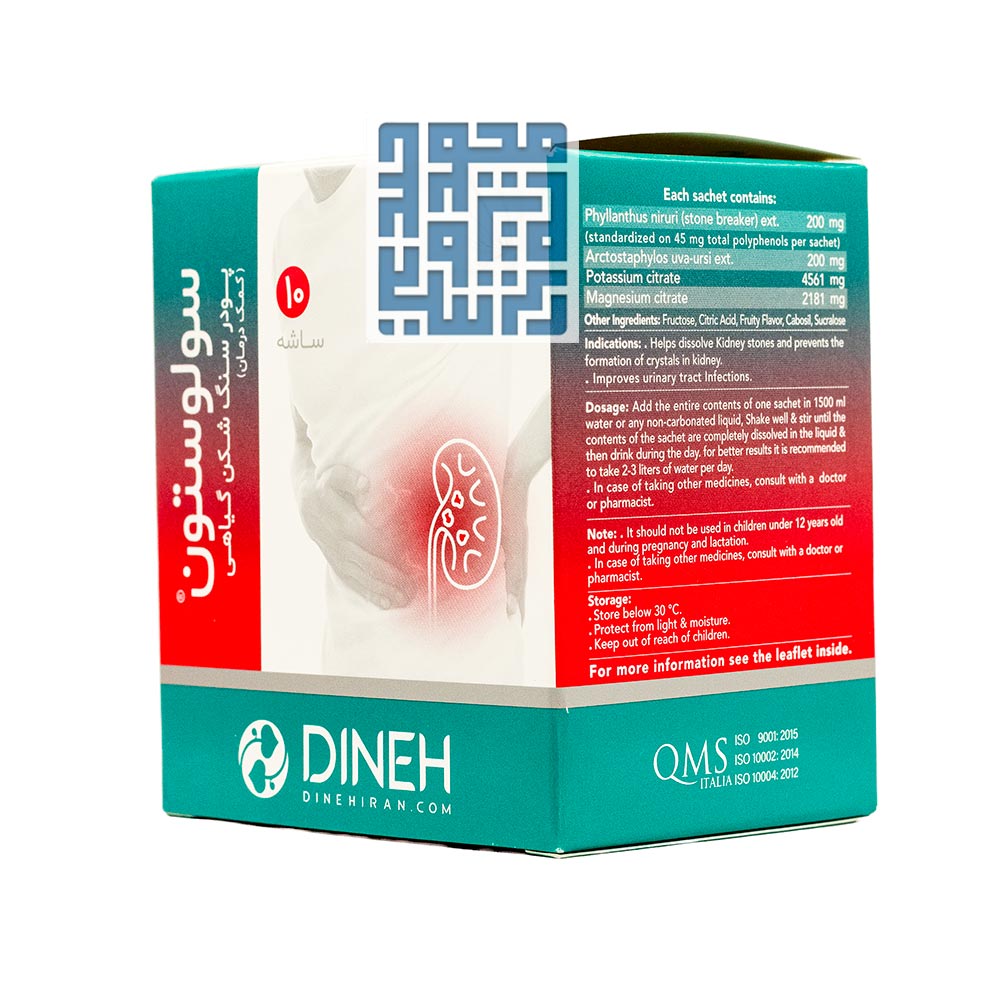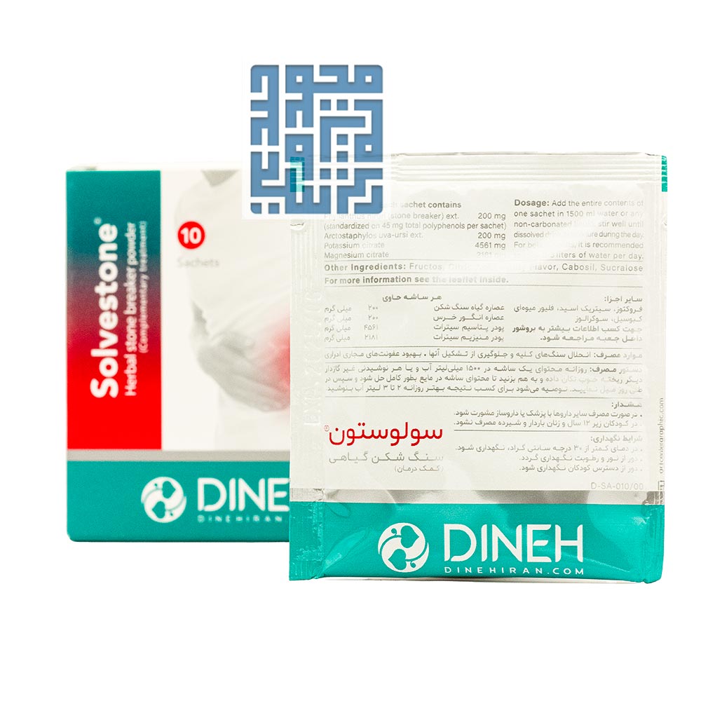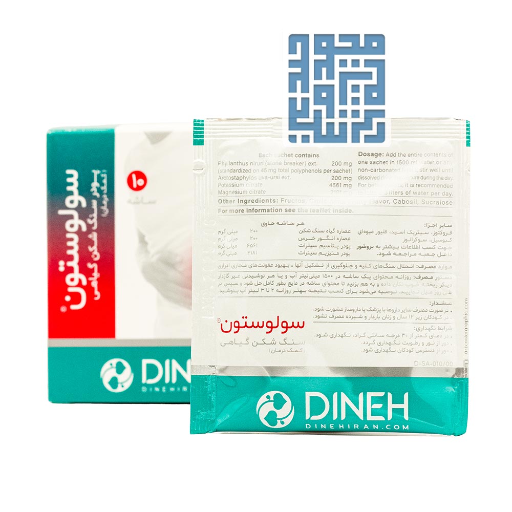 ساشه سنگ شکن گیاهی سولوستون دینه یک مکمل کلیه و مجاری ادراری مناسب برای افراد مبتلا به سنگ کلیه بوده و به انحلال سنگهای کلیه کمک شایانی کرده و عملکرد مجاری ادراری را بهبود میبخشد. این محصول حاوی 10 عدد ساشه بوده که از تشکیل کریستالهای کلسیم اگزالات و اسیداوریک در کلیه جلوگیری میکند. هر ساشه حاوی عصاره گیاه سنگ شکن، عصاره انگور خرس، پودر پتاسیم سیترات و پودر منیزیم سیترات بوده و بهواسطه همین ترکیبات مؤثر عملکرد مجاری ادراری را بهبود بخشیده و از بروز عفونت در آن پیشگیری میکند.