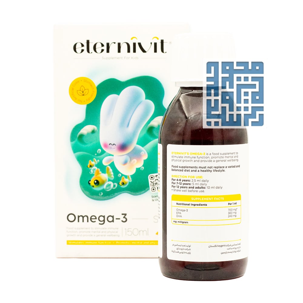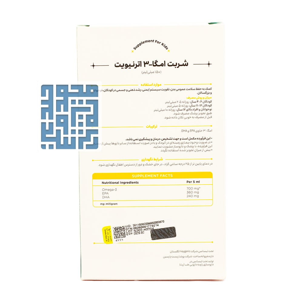 شربت امگا 3 اترنیویت برای رساندن اسیدهای چرب ضروری امگا ۳، به ویژه ایکوزاپنتانوئیک اسید (EPA) و اسید دوکوزاهگزانوئیک (DHA) که برای جنبههای مختلف سلامت از جمله رشد شناختی، سلامت قلب و عروق و عملکرد سیستم ایمنی ضروری هستند، فرموله شده. این محصول تحت لیسانس کیجنیک انگلستان در یک بطری ۱۵۰ میلی لیتری در داروسازی زاویه دارویی طب آریانا در ایران تولید و عرضه میشود.