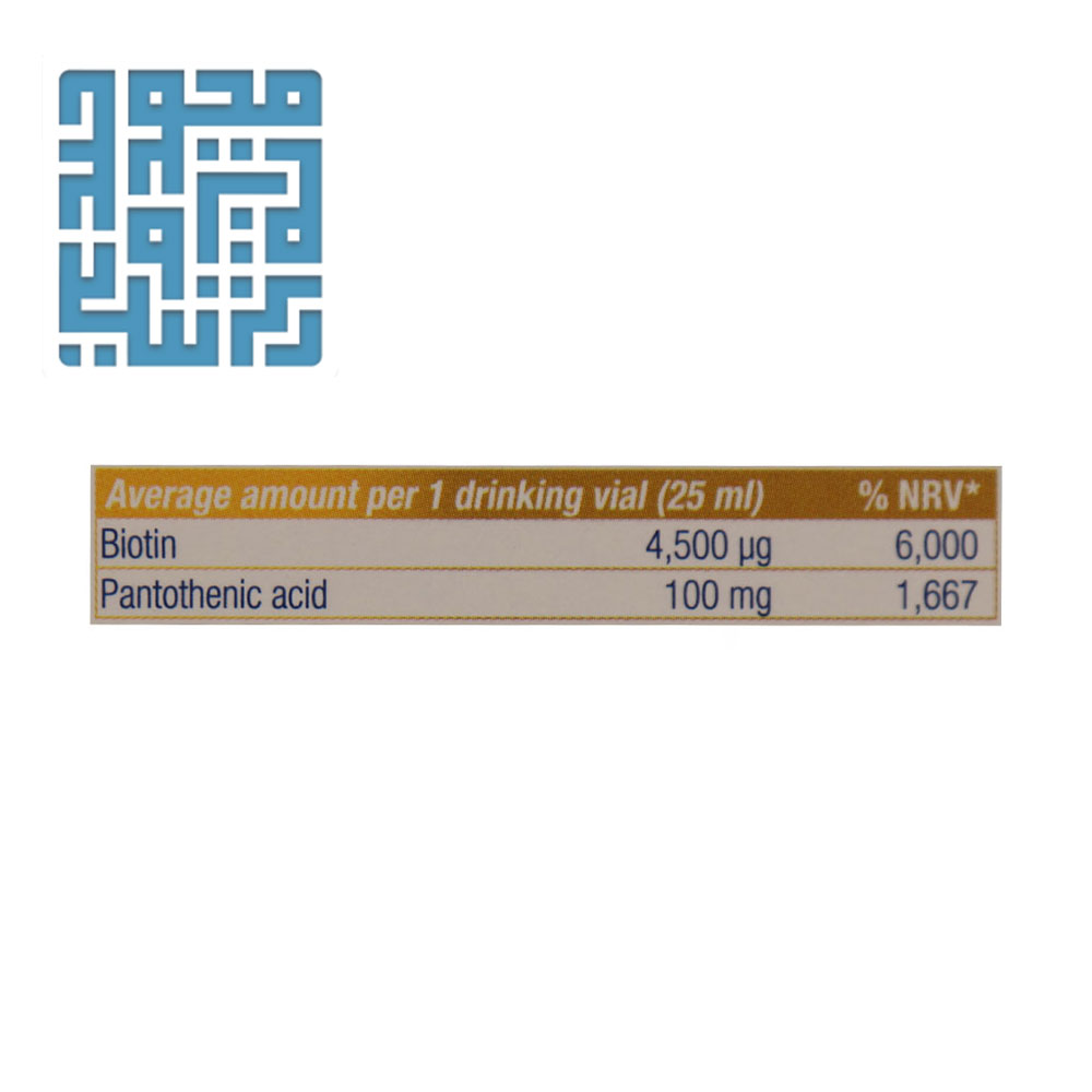 بیوتین در هر ویال به مقدار ۴۵۰۰ میکروگرم موجود است که نزدیک به ۶۰۰۰% از نیاز روزانه بدن را تأمین میکند. این مقدار بالای بیوتین به تحریک تولید کراتین، پروتئین اصلی ساختار مو و ناخن، کمک میکند. از این رو، بیوتین میتواند به حفظ ضخامت مو، جلوگیری از ریزش و بهبود شکنندگی ناخنها کمک کند. بیوتین علاوه بر نقش در تقویت مو، در حفظ سلامت پوست نیز مؤثر است و با جلوگیری از خشکی و التهابات پوستی به بهبود ظاهر پوست کمک میکند.