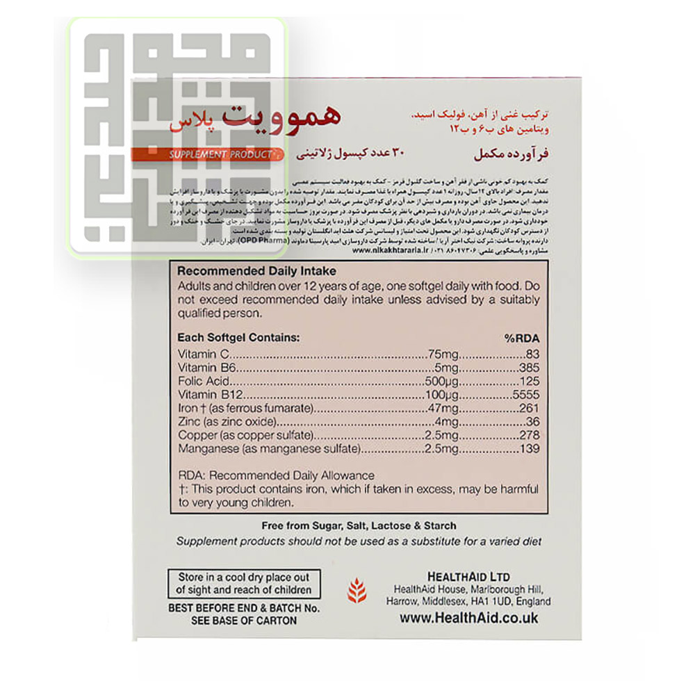 برای اطلاعات در مورد آلرژنها، از جمله گلوتن، به بسته بندی محصول هموویت پلاس مراجعه کنید یا با سازنده مشورت کنید.