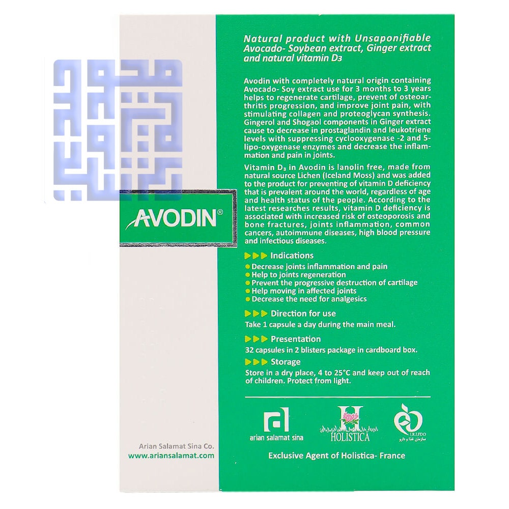 کپسول آوودین هولیستیکا موجب بهبود التهاب و کاهش درد مفاصل میشود. ترکیبات این کپسول شامل آووکادو و سویا بوده که برای بازسازی، بهبود درد و التهاب مفاصل بسیار مفید است و موجب آسانشدن تحرک آنها میشود. مصرف این کپسول با کاهش وابستگی به داروهای مسکن همراه بوده و موجب کندشدن و درنهایت جلوگیری از روند تخریب غضروف، جلوگیری از کمبود ویتامین D3، کاهش درد و التهاب مفاصل میشود. کپسول آوودین هولیستیکا با منشأ گیاهی همانند سویا، آووکادو و زنجبیل در کاهش التهابات مفاصل و بازسازی غضروفها نقش مهم و مؤثری دارد.