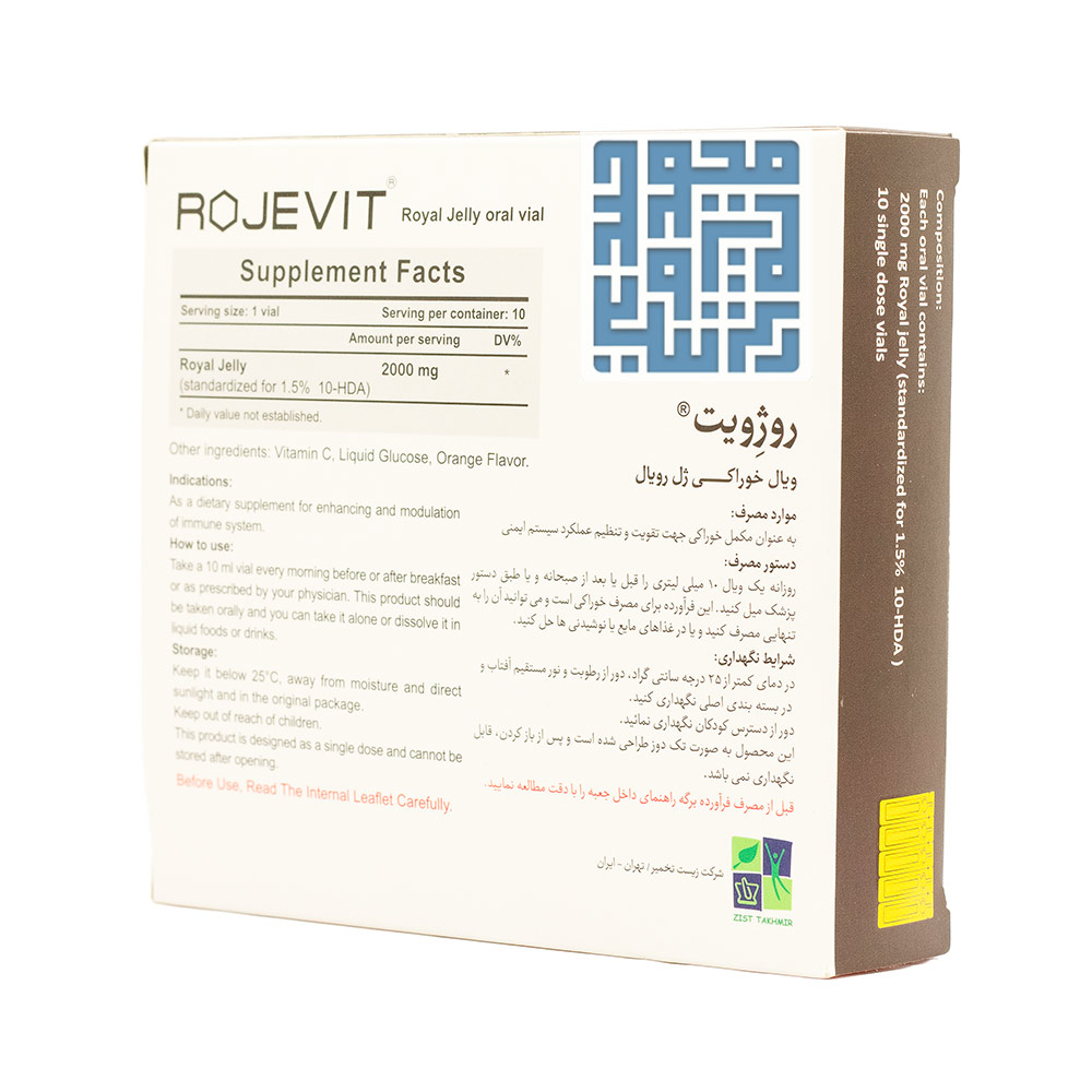 ویال ژل رویال روژویت زیست تخمیر یک تقویت سیستم ایمنی است که برای استفاده از فواید سلامتی ژل رویال طراحی شده و دوز قوی 2000 میلی گرم در هر ویال را ارائه میدهد. هدف ویال خوراکی ژل رویال روژویت ارائه منبع غلیظی از ترکیبات زیست فعال ژل رویال برای حمایت از جنبههای مختلف سلامتی است.