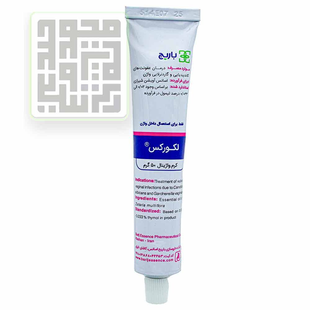 کرم واژینال لکورکس باریج اسانس یک داروی گیاهی بوده که برای درمان عفونتهای باکتریایی و قارچی واژن استفاده میشود. این دارو حاوی اسانس روغنی گیاه آویشن شیرازی بوده که دارای خواص ضدالتهابی، ضدباکتری و ضدقارچ است. کرم واژینال لکورکس باریج اسانس برای درمان عفونت باکتریایی کاندیدیایی و گاردنلا مفید است و بر اساس وجود 02/0 الی 033/0 درصد تیمول در فراورده استاندارد شده است.