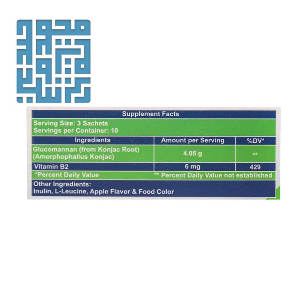 گلوکومانان ام پلاس، ترکیبی متشکل از 1.35 گرم فیبر گلوکومانان بهدستآمده از ریشه گیاه کنجاک و 2 میلیگرم ویتامین B2 در هر ساشه است. این پودر بهعنوان یک مکمل تغذیهای، با هدف کمک به کاهش وزن، کاهش اشتها، کنترل قند خون و بهبود یبوست تهیه شده است. طراحی آن بهگونهای بوده تا هم در رژیمهای کاهش وزن و هم برای بهبود سلامت گوارش کاربرد داشته باشد.