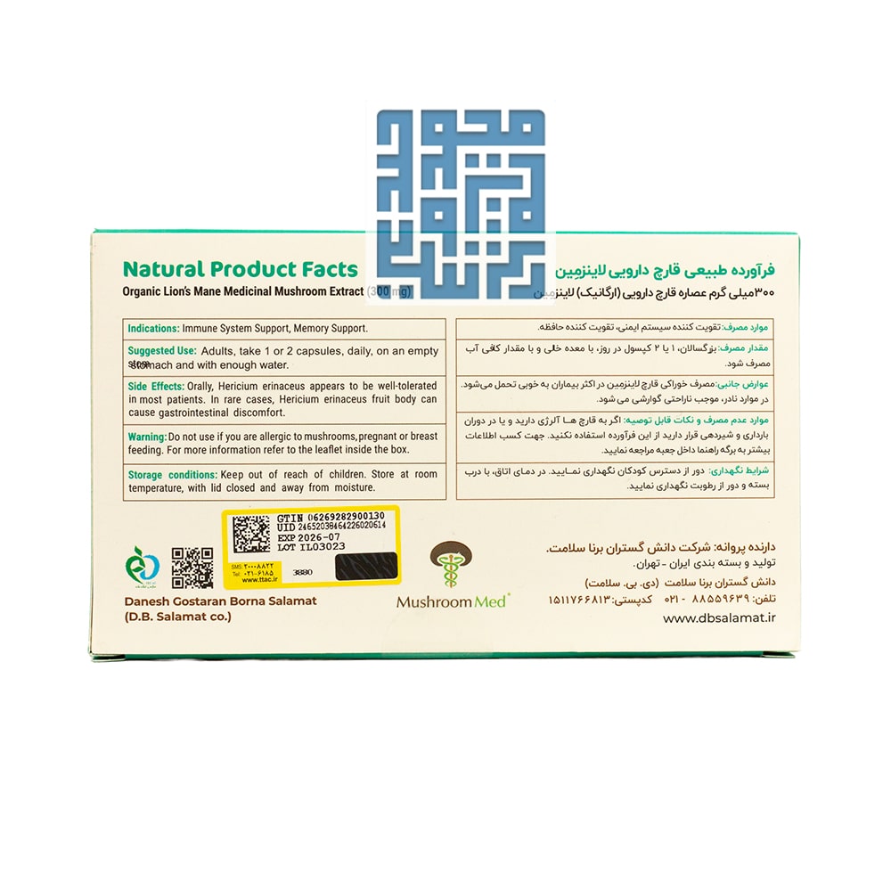 حاوی 300 میلی گرم عصاره قارچ دارویی (ارگانیک) لاینزمین