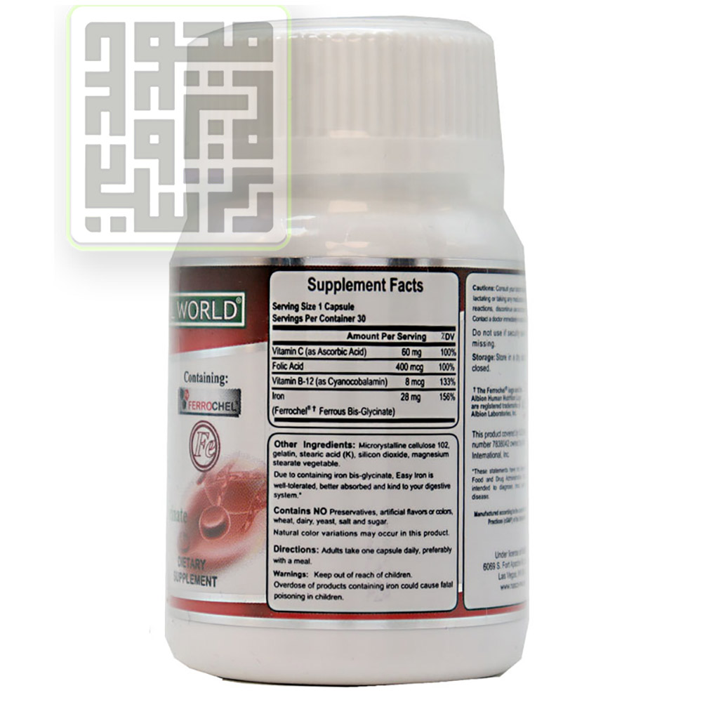 کپسول ایزی آیرون نچرال ورلد، یک مکمل غذایی مناسب برای همه افراد بوده و یک فرآورده تخصصی برای درمان و کنترل کمخونی ناشی از فقر آهن است. کپسول ایزی آیرون حاوی آهن بهصورت فروس بیس گلیسینات، فولیکاسید، ویتامین ب 12 و ویتامین سی میباشد.