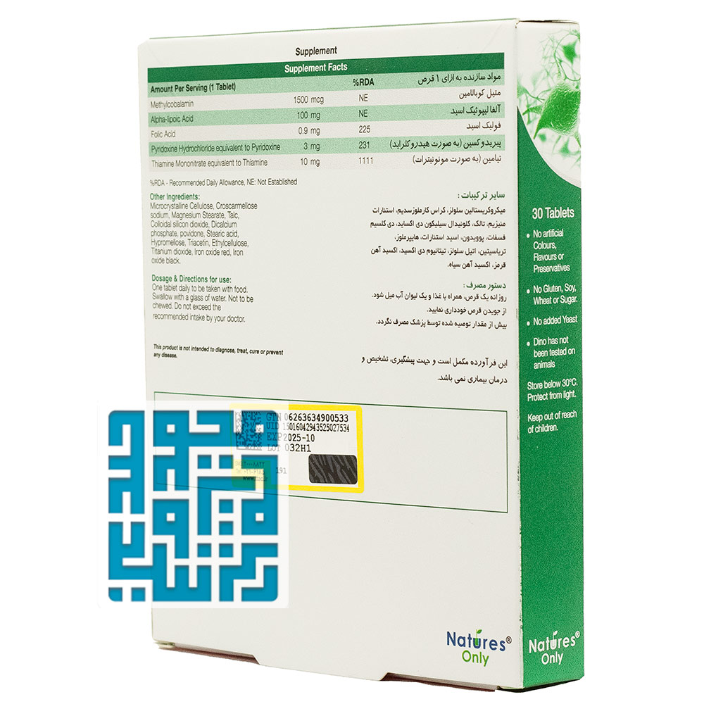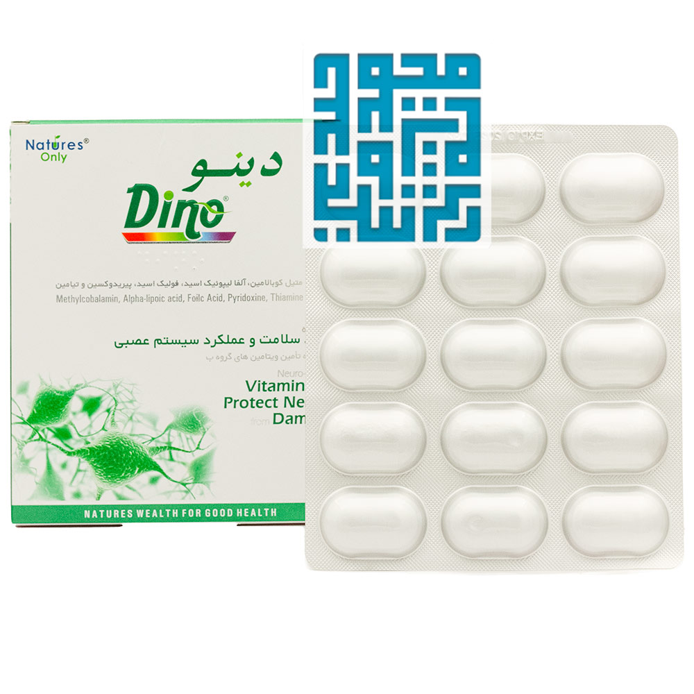 قرص دینو نیچرز اونلی برای حمایت از سیستم عصبی فرموله شده. این قرصها حاوی ترکیبی از متیل کوبالامین، آلفا لیپوئیک اسید، اسید فولیک، پیریدوکسین و تیامین هستند.