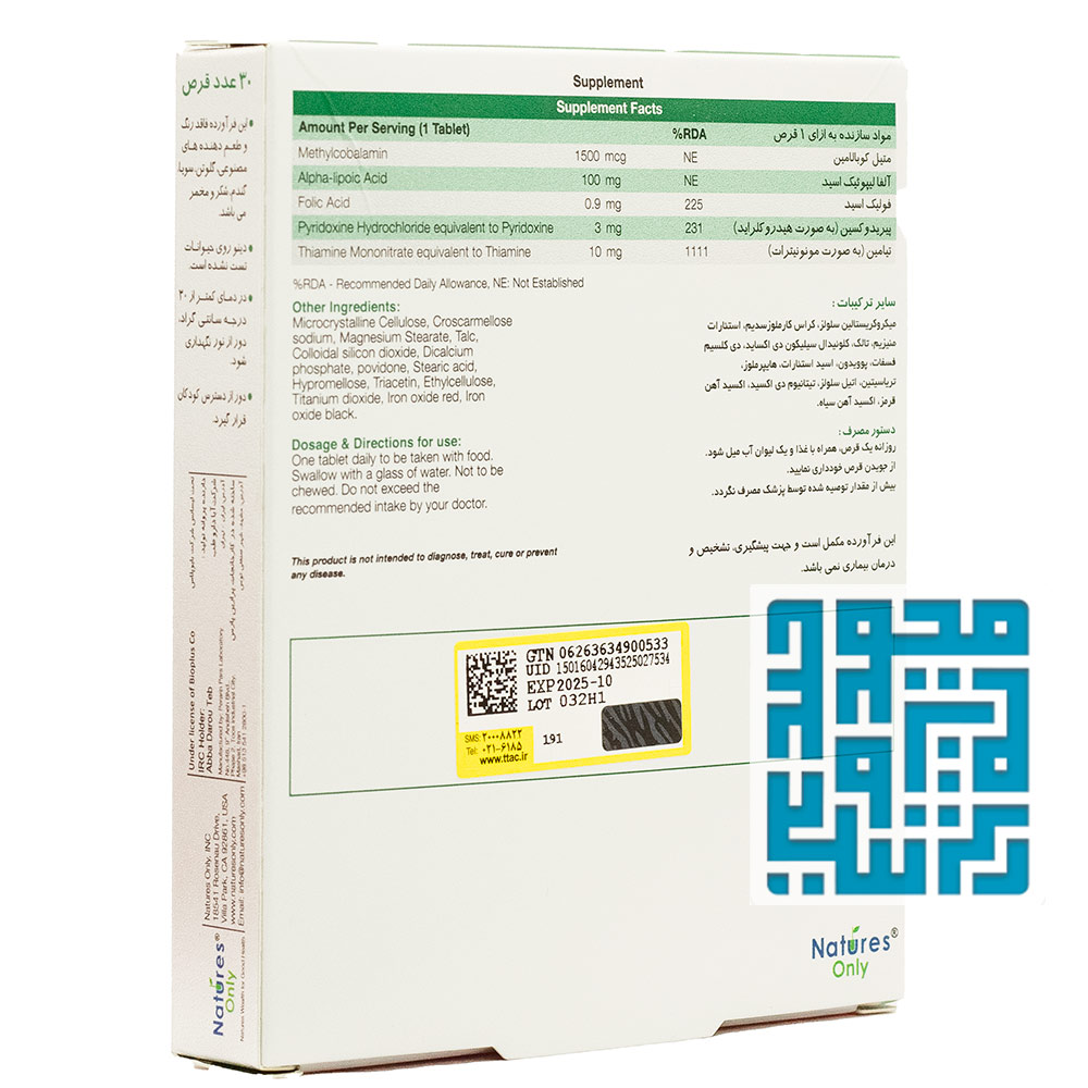 قرص دینو نیچرز اونلی یک مکمل اعصاب بسیار عالی برای حمایت از سیستم عصبی است. این قرص حاوی آلفا لیپوئیک اسید، ویتامین B12، اسید فولیک، پیریدوکسین و تیامین است. این ترکیب نه تنها از آنتی اکسیدان محافظت کرده بلکه از تولید انرژی و سلامت سلولهای عصبی نیز پشتیبانی میکند.